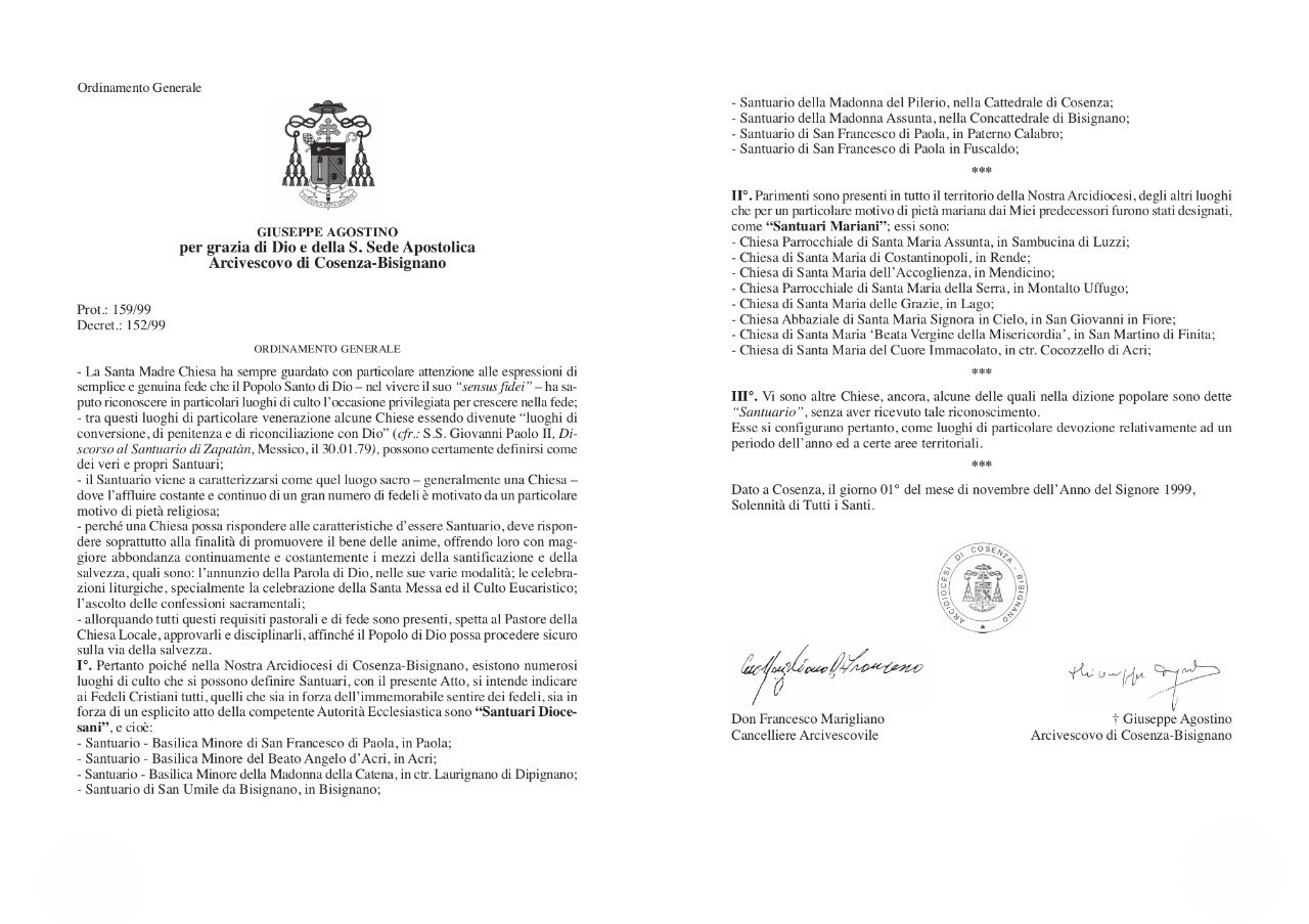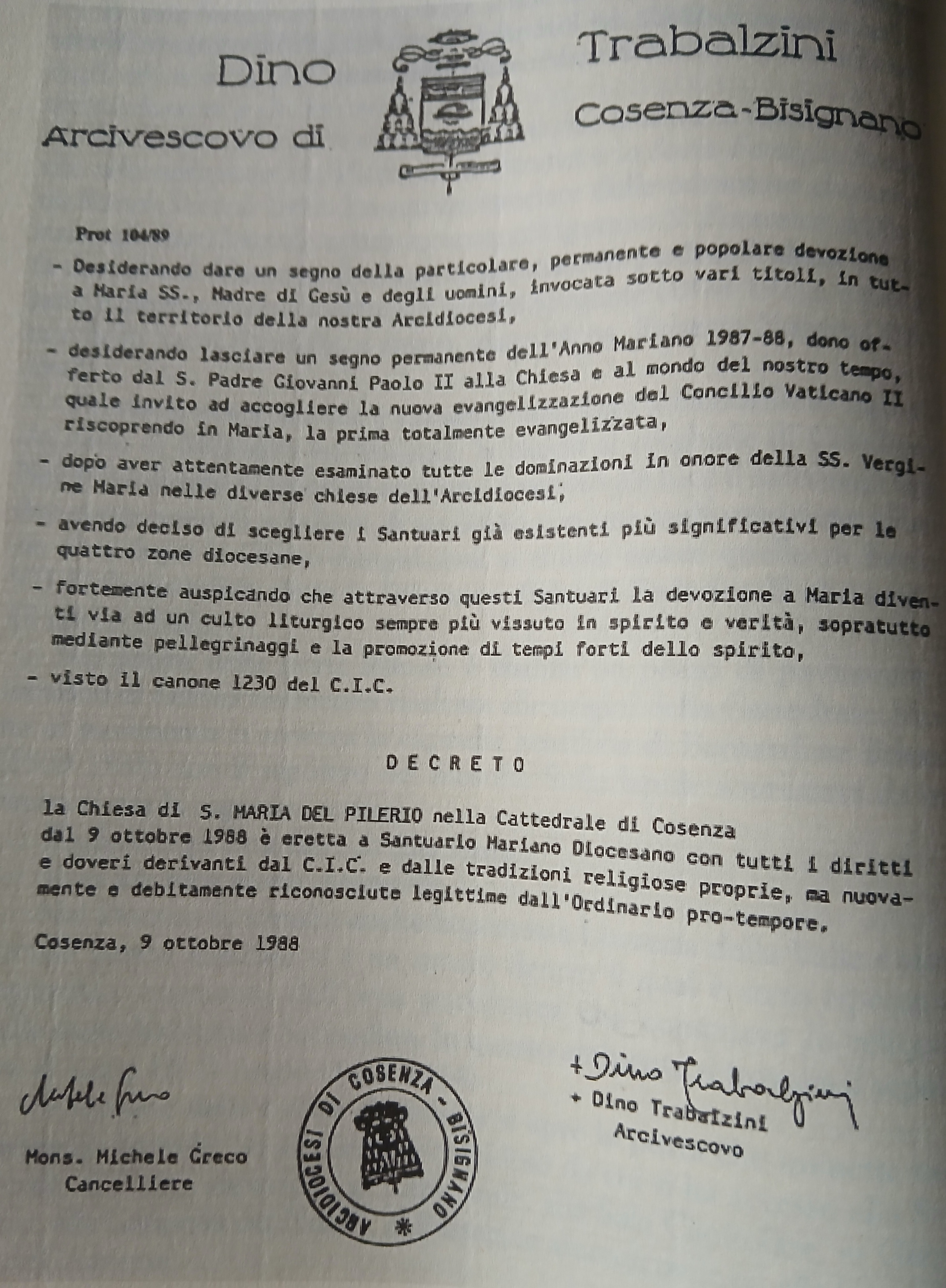 Il 12 febbraio 1981 l'arcivescovo di Cosenza e vescovo di Bisignano mons. Dino Trabalzini elevò con il titolo di Santuario la Cattedrale, chiesa principale dell'arcidiocesi di Cosenza-Bisignano e Duomo di Cosenza dove il vescovo ha la sua cattedra, oggi sede della parrocchia Santa Maria Assunta. Il 9 ottobre 1988 (Prot. 104/89) mons. Dino Trabalzini, volendo lasciare un segno permanente dell'Anno Mariano 1987-88 offerto dal Santo Padre Giovanni Paolo II alla chiesa, dichiarò Santuario Mariano Diocesano alla Madonna del Pilerio Patrona principale della Diocesi di Cosenza-Bisignano, confermando il titolo di Patrona della città di Cosenza, da mons. Trabalzini. Il 1 novembre 1999 (Prot.: 159/99 - Decret.: 152/99) il luogo sacro è stato indicato, in forza dell'immemorabile sentire dei fedeli, come Santuario Diocesano nell'Ordinamento Generale dell'arcivescovo mons. Giuseppe Agostino. Il Capitolo della Cattedrale cura e valorizza il valore storico, artistico e religioso del culto alla Madonna del Pilerio. La festa principale viene celebrata, con grande concorso di fedeli-pellegrini, il 12 febbraio, festa patronale preceduta da un settenario. In circostanze particolari si porta in processione, invece della statua della Madonna del Pilerio, l'icona della Madonna come è avvenuto nel 1988, Anno Mariano, in occasione del Giubileo del 2000 e nella celebrazione dell'Ottavo Centenario della Cattedrale (1222-2022)