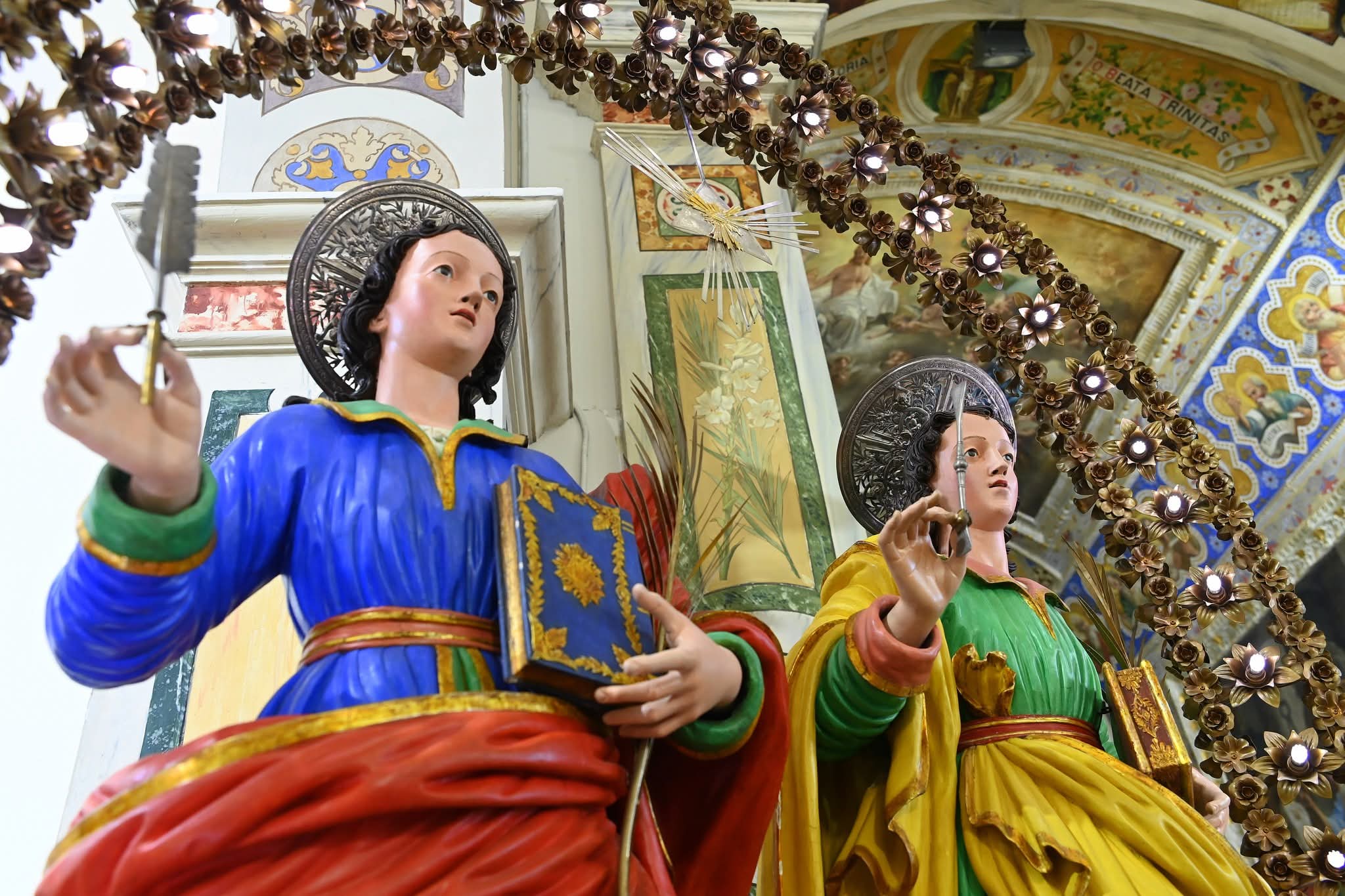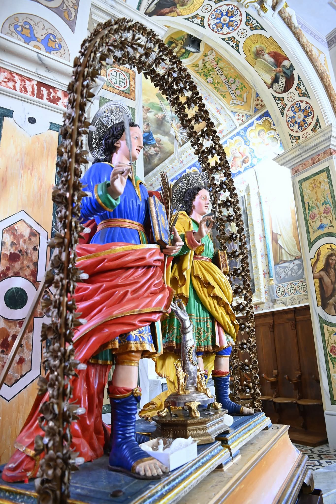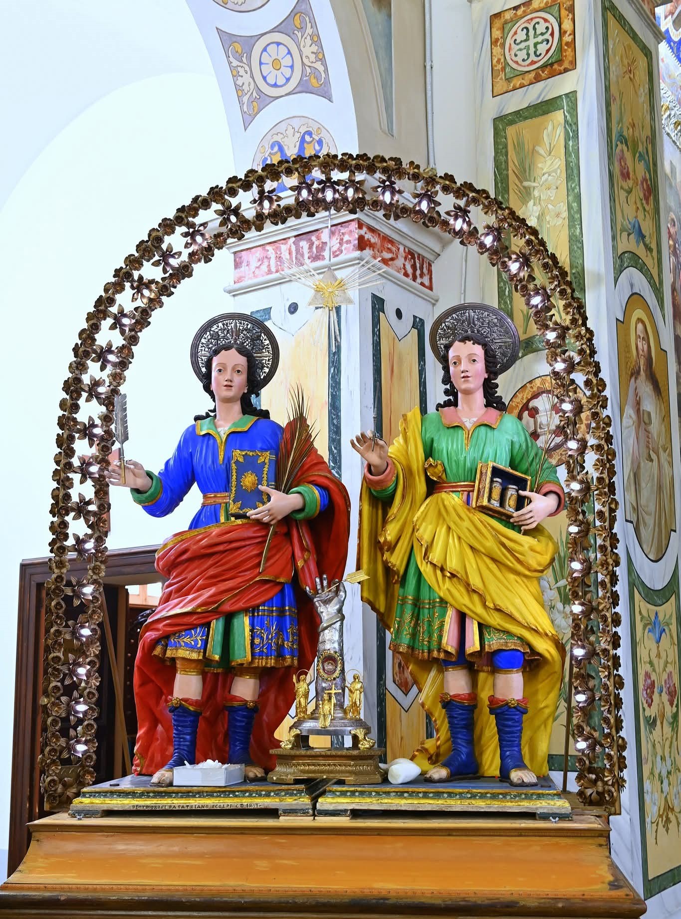 - NOTIZIE STORICO CRITICHE La prima chiesa e le strutture monastiche ad essa inizialmente collegate, sarebbero state fatte costruire da monaci italo-greci del monastero di San Giovanni Therestis di Bivongi, da cui dipendeva, tra la fine dell'XI e gli inizi del XII secolo. Estintasi la presenza monastica, la chiesa divenne infine cappellania in età moderna. Il luogo di culto ha ancora visibili parti della struttura originaria, seppur fortemente rimaneggiate nei secoli. La facciata è a salienti, con muratura a vista e tre portali d'ingresso. La pianta è longitudinale a tre navate con presbiterio rettangolare voltato a botte. All'interno una ricca decorazione architettonica in stucco dipinto e dipinti murali e su tela realizzati nel 1917 dai pittori Carmelo Zimatore e Diego Grillo (presbiterio) e nel 1942 dal solo Grillo (navata centrale), per lo più costituenti un ampio ciclo pittorico sulla vita, le opere ed il martirio dei santi Cosma e Damiano. Alcuni dipinti, olio su tela, opere di pittori locali di metà settecento e dell'ottocento, ancora presenti lungo le navate laterali, ricordano la presenza di altrettanti altari laterali, non più esistenti, dedicati a santi con forte valenza taumaturgica o legati all'Oriente cristiano, memoria di una presenza monastica italo-greca che per secoli è qui stata presente. La pittrice Aurora Agostini Amato di Lamezia Terme ha dipinto il quadro rintroducente il beato Zeffirino Giménez Malla, martire, un’opera molto apprezzata in tutto l’ambiente delle comunità dei Rom e Sinti del mondo. (https://www.beweb.chiesacattolica.it/edificidiculto/edificio/16544/Santuario+dei+Santi+Cosma+e+Damiano)