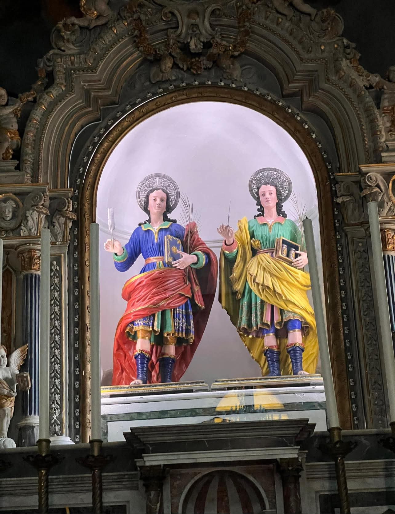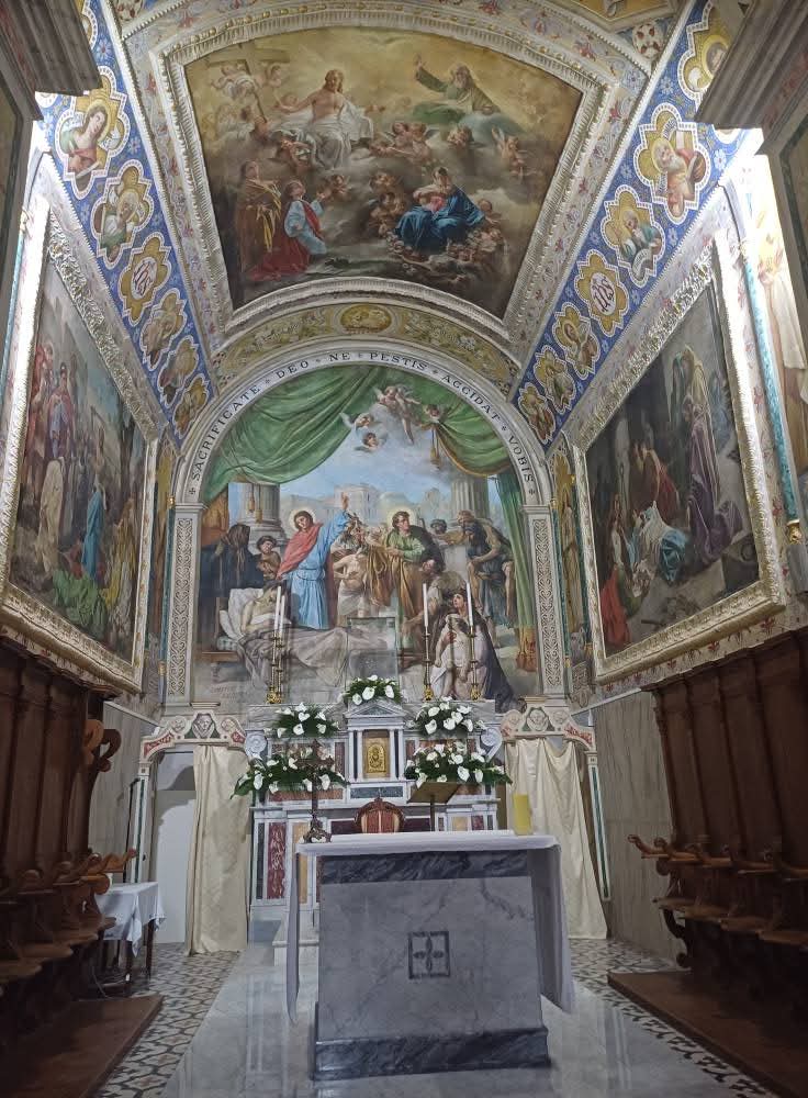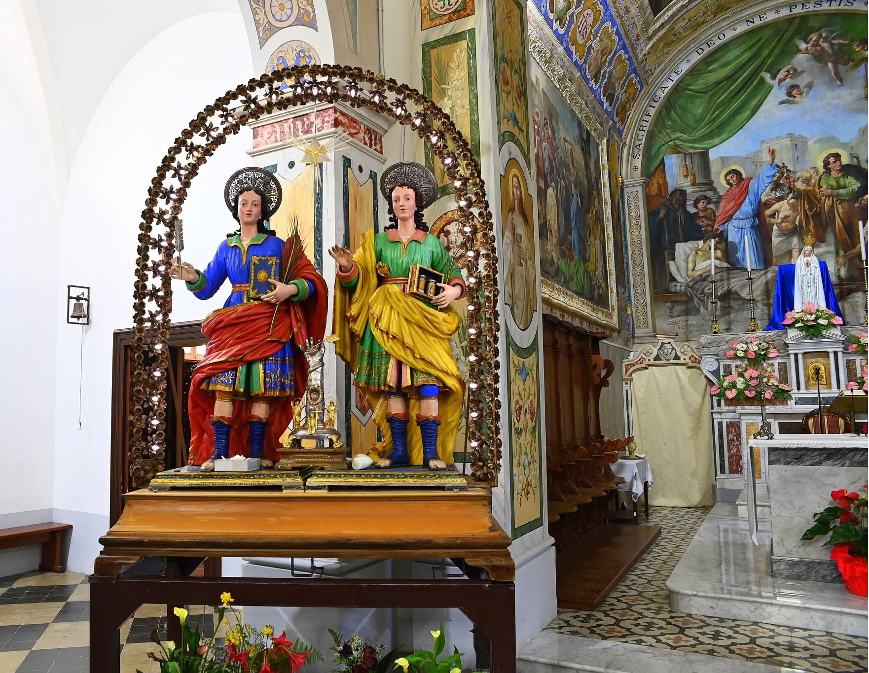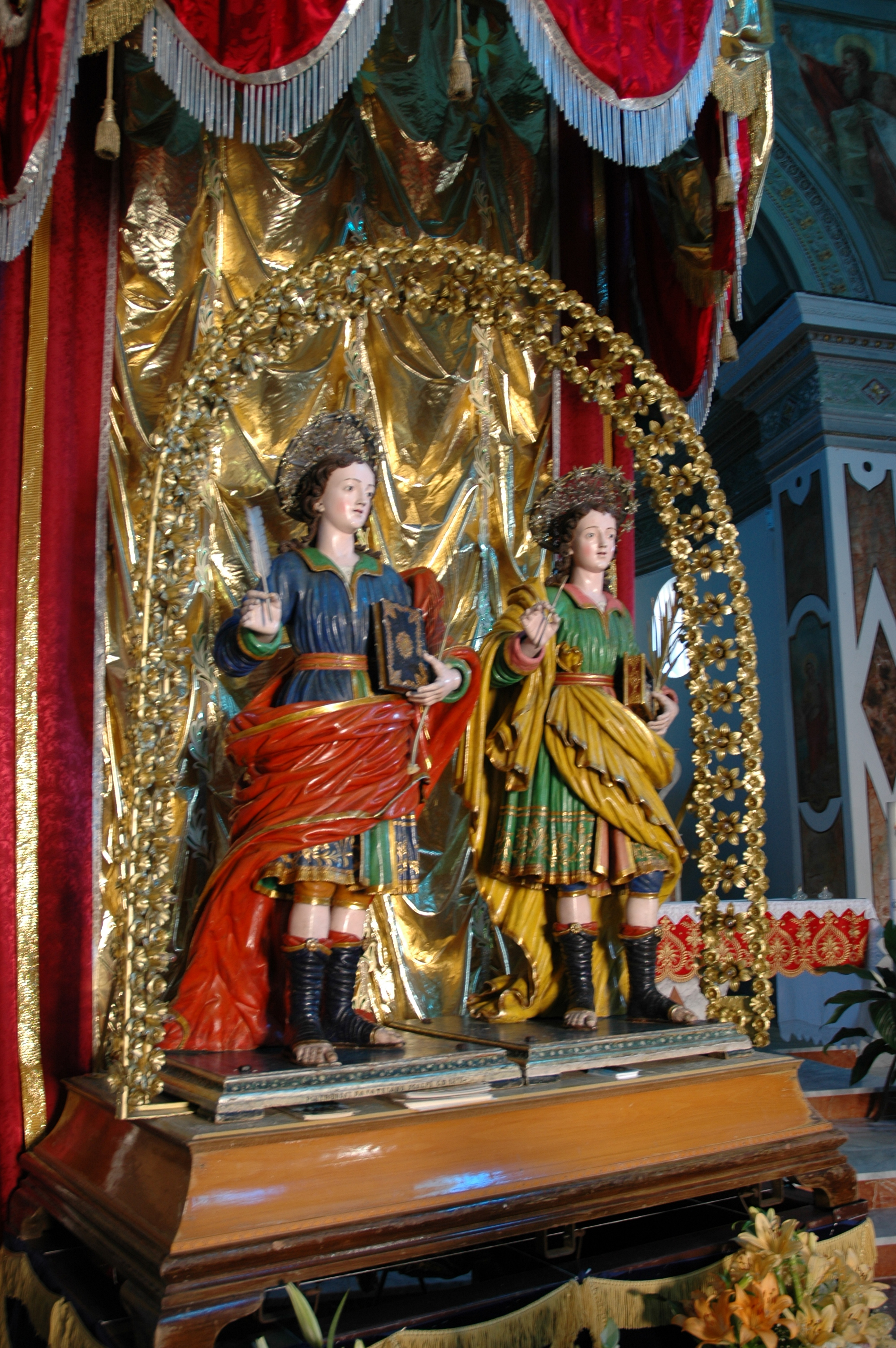 - NOTIZIE STORICO CRITICHE La prima chiesa e le strutture monastiche ad essa inizialmente collegate, sarebbero state fatte costruire da monaci italo-greci del monastero di San Giovanni Therestis di Bivongi, da cui dipendeva, tra la fine dell'XI e gli inizi del XII secolo. Estintasi la presenza monastica, la chiesa divenne infine cappellania in età moderna. Il luogo di culto ha ancora visibili parti della struttura originaria, seppur fortemente rimaneggiate nei secoli. La facciata è a salienti, con muratura a vista e tre portali d'ingresso. La pianta è longitudinale a tre navate con presbiterio rettangolare voltato a botte. All'interno una ricca decorazione architettonica in stucco dipinto e dipinti murali e su tela realizzati nel 1917 dai pittori Carmelo Zimatore e Diego Grillo (presbiterio) e nel 1942 dal solo Grillo (navata centrale), per lo più costituenti un ampio ciclo pittorico sulla vita, le opere ed il martirio dei santi Cosma e Damiano. Alcuni dipinti, olio su tela, opere di pittori locali di metà settecento e dell'ottocento, ancora presenti lungo le navate laterali, ricordano la presenza di altrettanti altari laterali, non più esistenti, dedicati a santi con forte valenza taumaturgica o legati all'Oriente cristiano, memoria di una presenza monastica italo-greca che per secoli è qui stata presente. La pittrice Aurora Agostini Amato di Lamezia Terme ha dipinto il quadro rintroducente il beato Zeffirino Giménez Malla, martire, un’opera molto apprezzata in tutto l’ambiente delle comunità dei Rom e Sinti del mondo. (https://www.beweb.chiesacattolica.it/edificidiculto/edificio/16544/Santuario+dei+Santi+Cosma+e+Damiano)