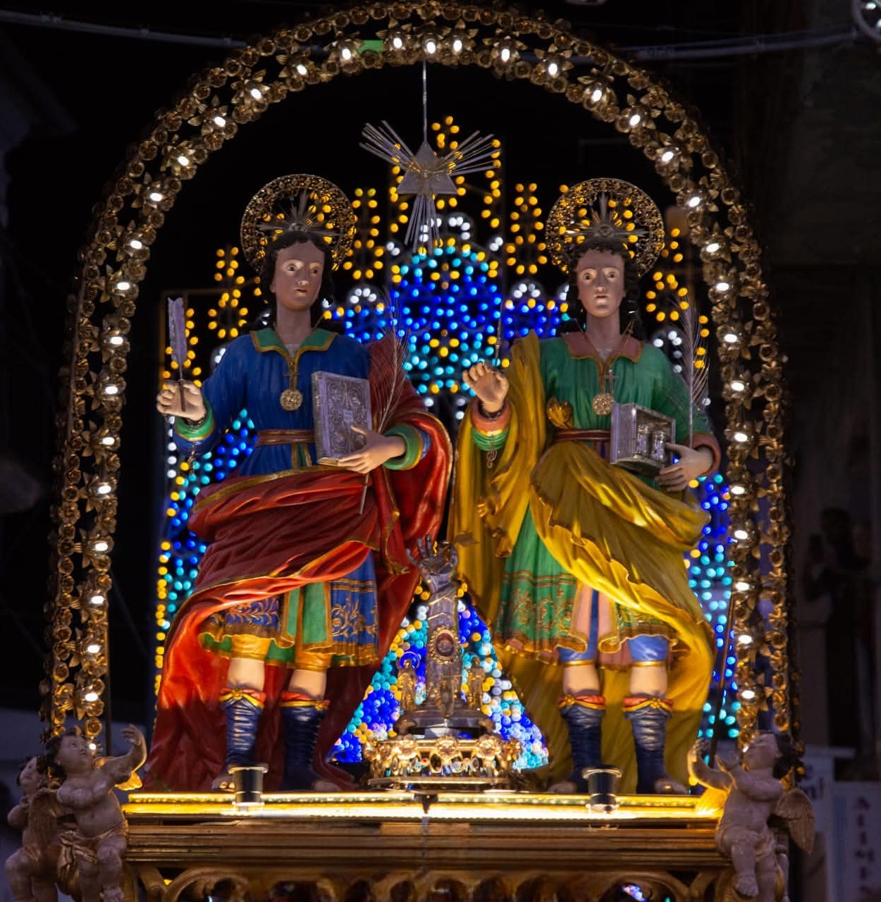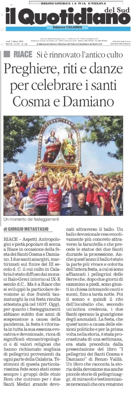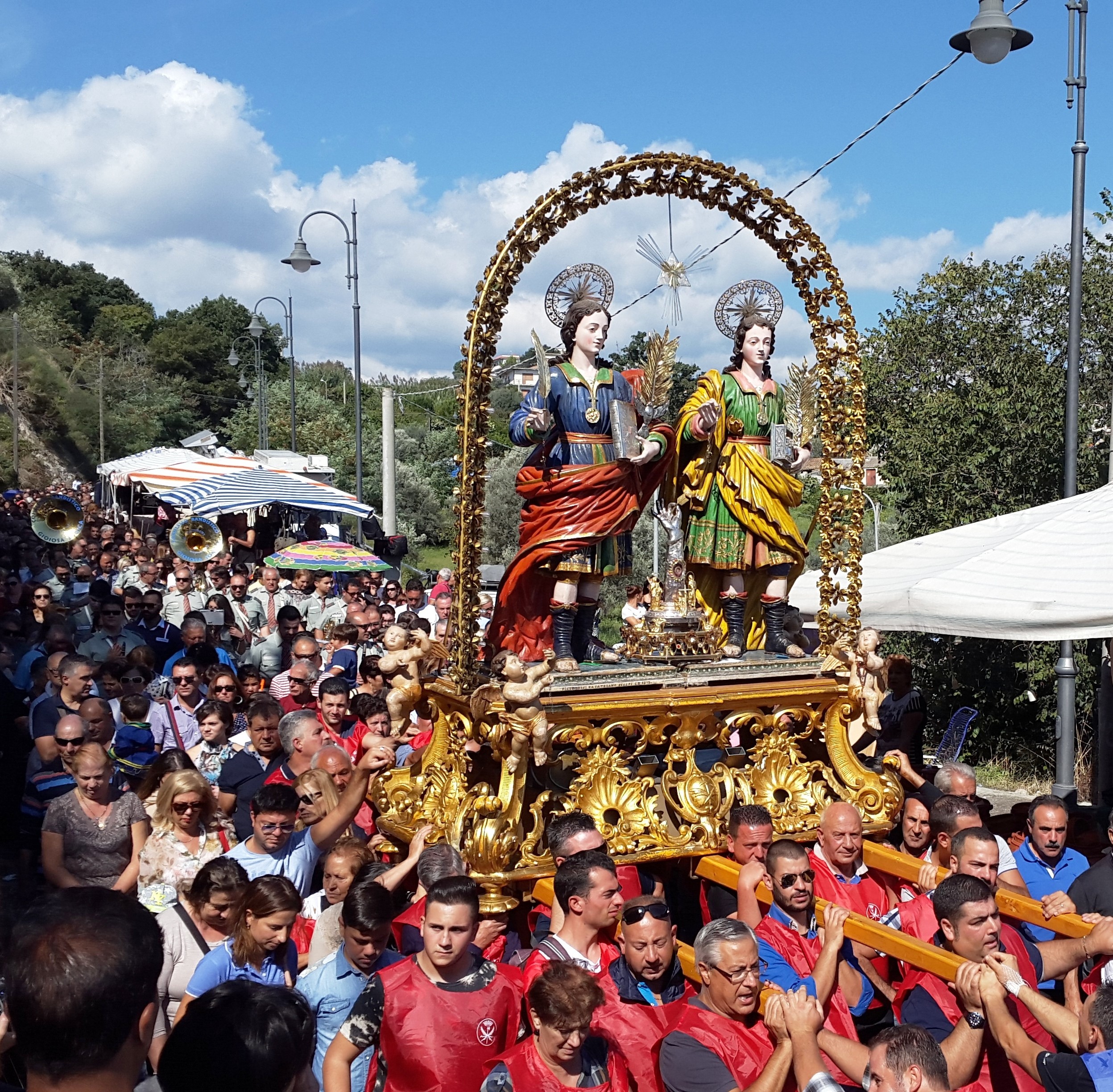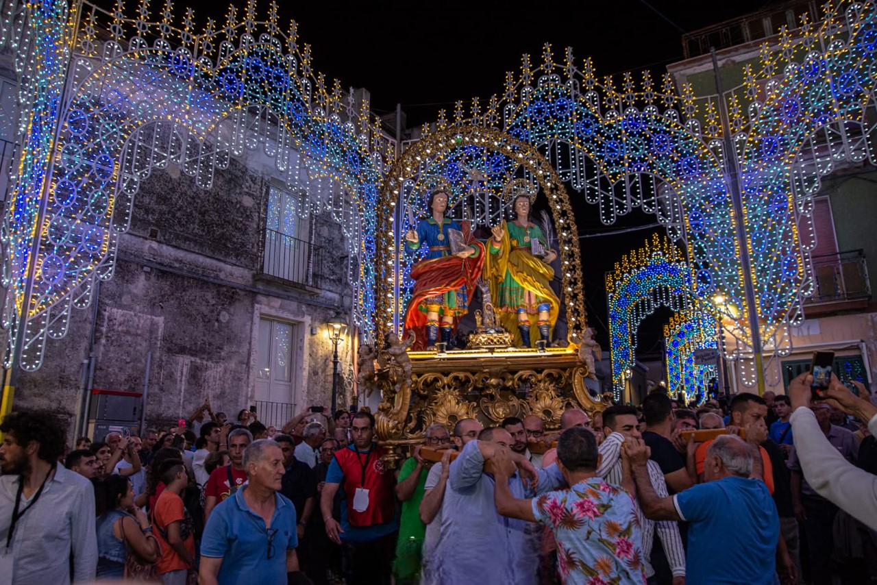 Il 26 settembre 2002 mons. GianCarlo Bregantini nel decreto per “l’Ordinamento Generale dei Santuari Diocesani” ha riconosciuto la chiesa dei Santi Medici Cosma e Damiano con il titolo di “Santuario Diocesano”. La festa dei Santi Medici Cosimo e Damiano, patroni di Riace, si svolge dal 25 al 27 settembre, preceduta da un novenario. Nel pomeriggio del 24, i devoti in processione portano, dal santuario alla chiesa Matrice di Santa Maria Assunta nel centro di Riace, le reliquie dei Santi, contenute in una teca a forma di avambraccio destro. Segue la celebrazione eucaristica, con la benedizione dei bambini. Sull’altare maggiore della chiesa Matrice sono collocate le statue dei Santi Medici. Giorno 25 moltissimi pellegrini arrivano nel sacro luogo per ringraziare o avere una grazia dai Santi; tanti, dopo aver camminato per ore, seguono la messa e il rito dell’«incubatio». Trascorrono la notte, recitando preghiere ed intonando canti popolari. La chiesa viene addobbata con il cosiddetto «paratu», decorazioni in stoffa e carta, dai colori vivacissimi, che vengono appese ai muri, formando un gioco di archi e colonne. Il 26 mattina, dalla chiesa Matrice muove una grande folla in processione che porta trionfalmente le statue dei gloriosissimi Santi Medici al santuario, che dista circa tre chilometri dal centro abitato. I Rom, provenienti da tutta la Calabria, dinanzi le statue, danno vita ad uno ballo processionale che rappresenta uno spettacolo unico e suggestivo. In tarda sera, veglia di preghiera. Il 27 sera, processione di rientro delle statue nella chiesa Matrice, oltre che diverse tele ottocentesche che un tempo ornavano gli altari laterali dell’antico tempio degli Anargiri