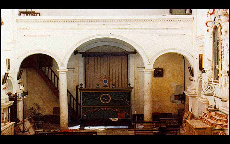 La struttura della chiesa è costituita da murature portanti in calcarenite che definiscono complessivamente le strutture verticali dell'edificio; ad esse si innestano, in corrispondenza del lato W dell'abside, le murature della sagrestia e del vano accessorio, che proseguono superiormente delimitando altri locali di pertinenza dell'annesso convento francescano. Tutte le strutture murarie sono costituite prevalentemente da pietrame informe allettato con malta di calce e sabbia, ma presentano, in generale, conci squadrati di calcarenite in corrispondenza dei cantonali e delle incorniciature delle finestre; in particolare, nel prospetto principale della chiesa, sono realizzate in conci regolari lasciati a vista le paraste di estremità, gli apparati architettonico-decorativi del portale e del finestrone, le due fasce mercapiano orizzontali e quella che incornicia superiormente il frontone. Alla struttura del prospetto principale e del muro E della chiesa si addossano, ma senza adeguato ammorsamento, i muri perimetrali del campanile, caratterizzati da un'analoga struttura, e pertanto realizzati prevalentemente in pietrame informe, ad eccezione dei cantonali e, sul fronte meridionale adiacente al prospetto della chiesa, dell'intera cella campanaria e delle incorniciature delle aperture che si aprono sui due livelli sottostanti. A sua volta anche l'involucro murario del vano cilindrico che contiene la scala a chiocciola della cella campanaria non mostra un adeguato raccordo con le strutture del campanile, fra le quali è inserito; esso è realizzato in conci regolari nella parte inferiore dove si incastrano i gradini, ed in pietrame irregolare nella parte sommitale. Gli orizzontamenti della chiesa e dei vani annessi sono realizzati in conci cuneiformi di calcarenite, presumibilmente disposti ad anelli concentrici nella sagrestia e nel vano accessorio, come si può dedurre dal raffronto con le analoghe strutture di alcuni vani simili, situati nell'annesso convento. La configurazione strutturale primaria è completata dal sistema della cantoria, costituito da tre archi su colonne realizzate in rocchi di calcarenite intonacati che, in collaborazione con i due pilastri e le due paraste inserite nella struttura muraria del prospetto principale, reggono le tre volte a crociera poste a sostegno della stessa cantoria