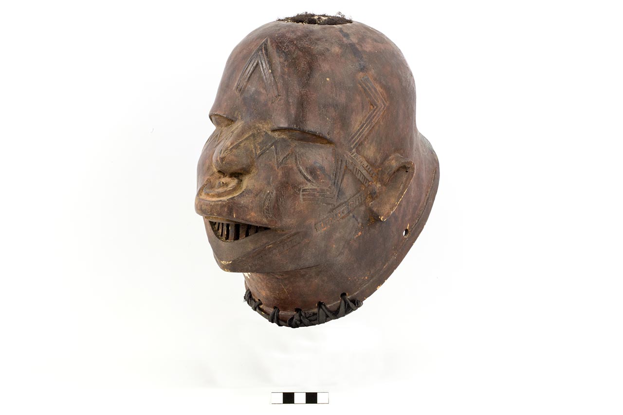 Maschera a casco in legno. Rapprsenta un volto umano caratterizzato dalla presenza di scarificazioni su tutta la superficie del volto. La bocca è stata realizzata aperta in modo tale da rendere visibile i denti e nel labbro superiore è stata intagliata una forma circolare a simulazione di un dilatatore