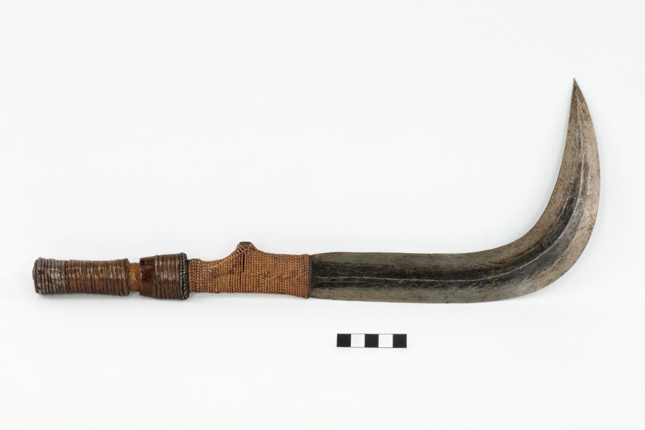 Pugnale con lama a roncola con nervatura centrale più spessa. Parte della lama vicino all'impugnatura è avvolta da un intreccio di rattan. Il manico è in legno ed è avvolto in strisce di ferro e rame