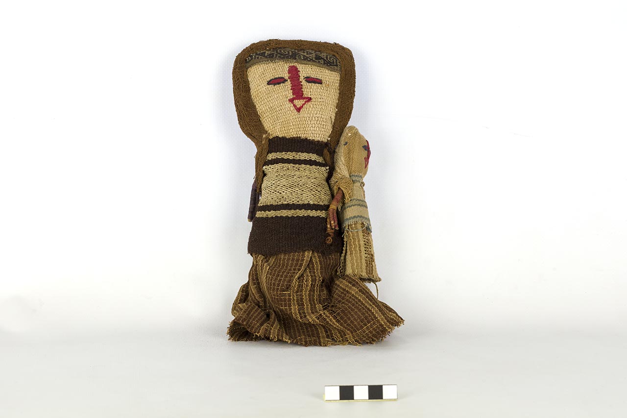 Bambola funeraria turistica in tela di colore marrone con cucita, presso il suo lato sinistro, una seconda figura più piccola