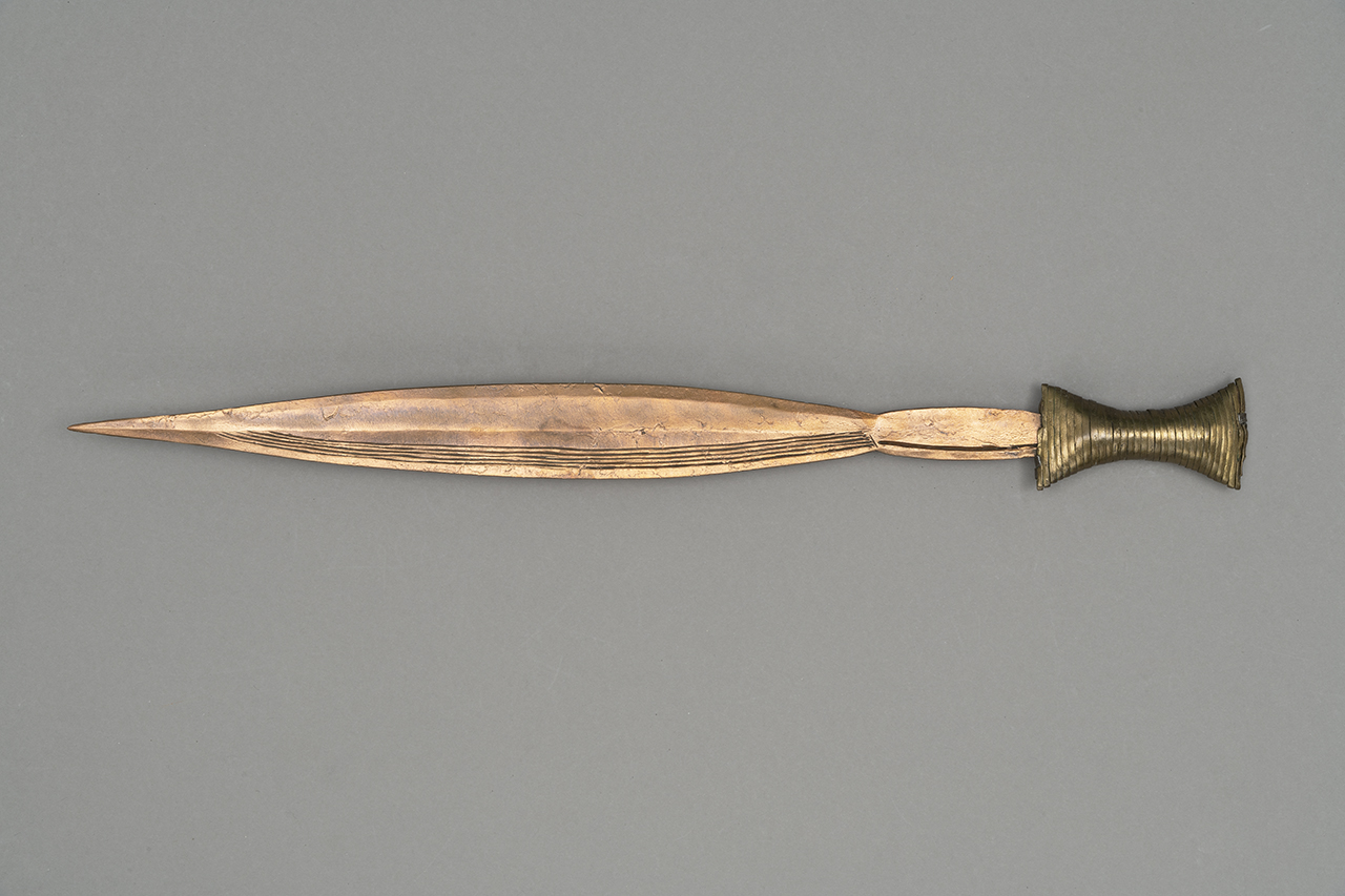 Daga costituita da una lama a doppio taglio in lega di rame e un manico in legno rivestito in ottone trafilato. La lama è composta da una sezione rettangolare con i lati leggermente convessi e una sezione di forma lenticolare con cresta centrale. Su ambo i lati sono state praticate delle incisioni decorative. Il manico a forma di clessidra è completamente rivestito con filamenti in lega di ottone. Si rilevano segni di ossidazione delle leghe metalliche