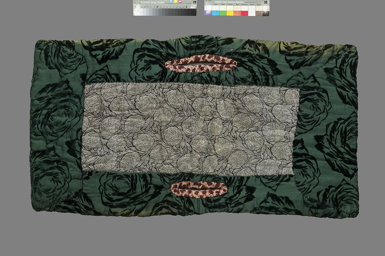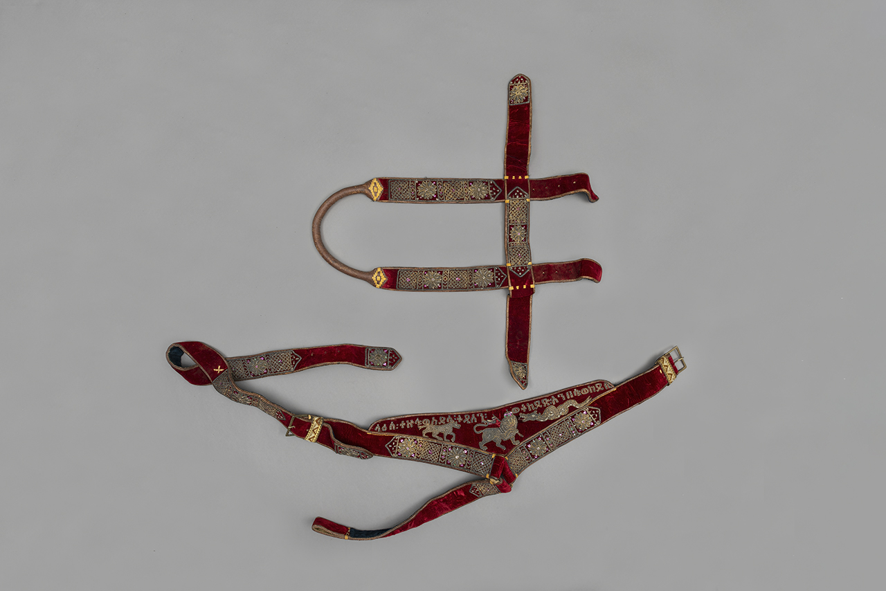 Finimenti da gala per mulo composti da: una sella in cuoio rivestita di velluto rosso e viola con cuciture dorate; una testiera in cuoio, rivestita esternamente di velluto rosso e internamente di velluto blu, con ricami dorati e vetri colorati applicati; una briglia in cuoio, rivestita esternamente di velluto rosso e internamente di velluto blu, agganciata al morso in acciaio e decorata con ricami dorati, passamaneria e vetri colorati; le redini in cuoio rivestite di seta dorata e unite da un moschettone in lega di ottone; un pettorale in cuoio rivestito di velluto rosso, decorato con ricami dorati, passamaneria e vetri colorati; una groppiera in cuoio rivestita di velluto rosso, con ricami dorati e passamaneria; un coprisella in velluto verde scuro ricamato a fiorami, con sezione centrale ricamata a motivi vegetali e asole rivestite in seta animalier; una gualdrappa in velluto rosso con finimenti in velluto verde scuro e ricami dorati. La sella è costituita da un seggio, un arcione anteriore con pomo decorato a ricami floreali, un arcione posteriore, e un portastaffile in cui è agganciato lo staffile con le staffe in lega d'argento