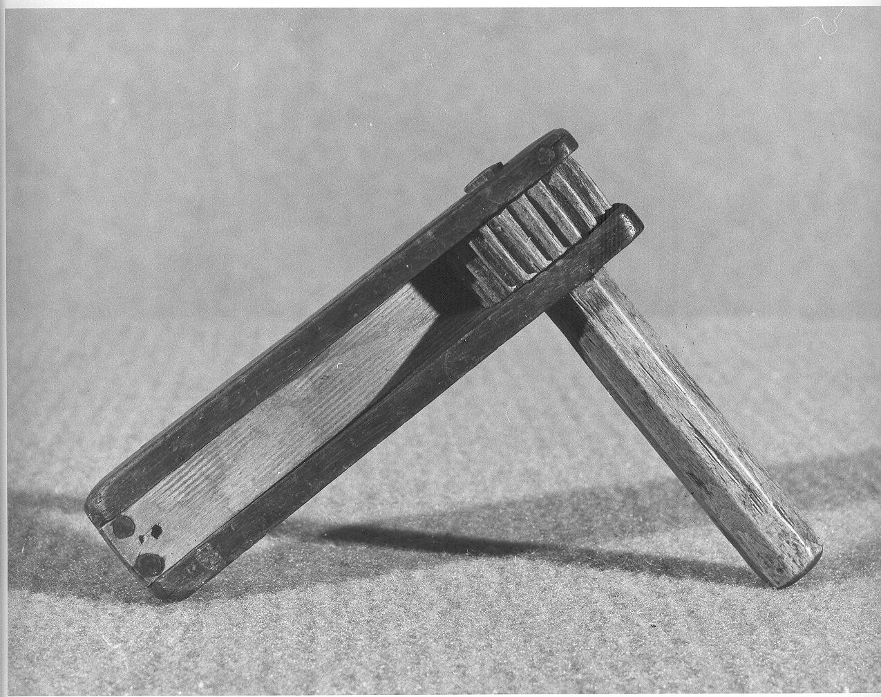 - FUNZIONE E MODALITÀ D'USO Usato per processioni o le feste del paeseImpugnandolo e facendo girare il telaio a linguetta, passando sui denti della ruota, produce un'insieme di suoni