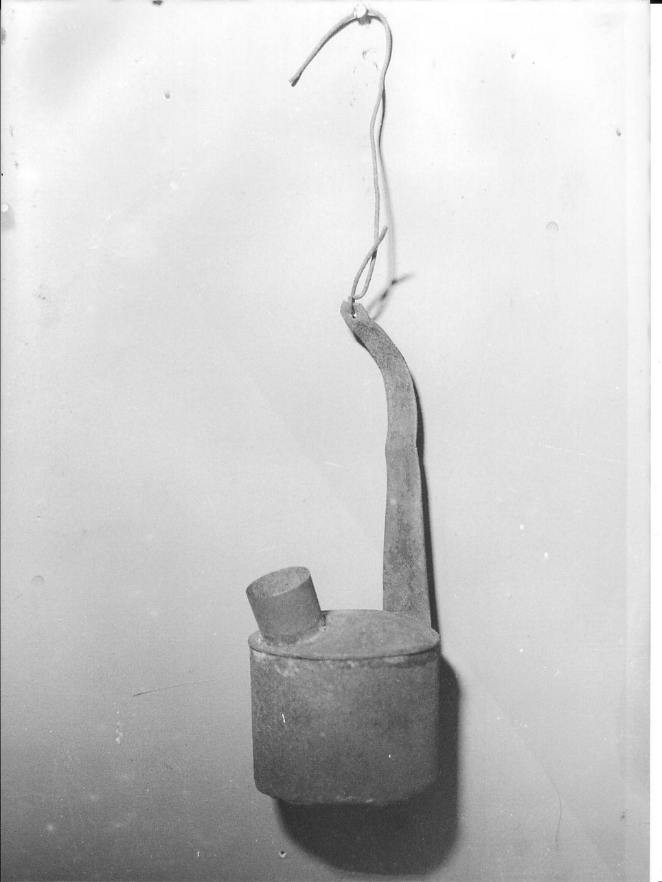 Si tratta di recipiente cilindrico conla base superiore bombata. Una lastra sottile di lamiera è saldata posteriormente e funge da impugnatura. L'asta è forata all'estremità e nel foro è fissato un uncino a fil di ferro. Sulla base superiore del recipiente vi è un piccolo becco cilindrico nel quale si innescava il meccanismo a rotelle per lo stoppino