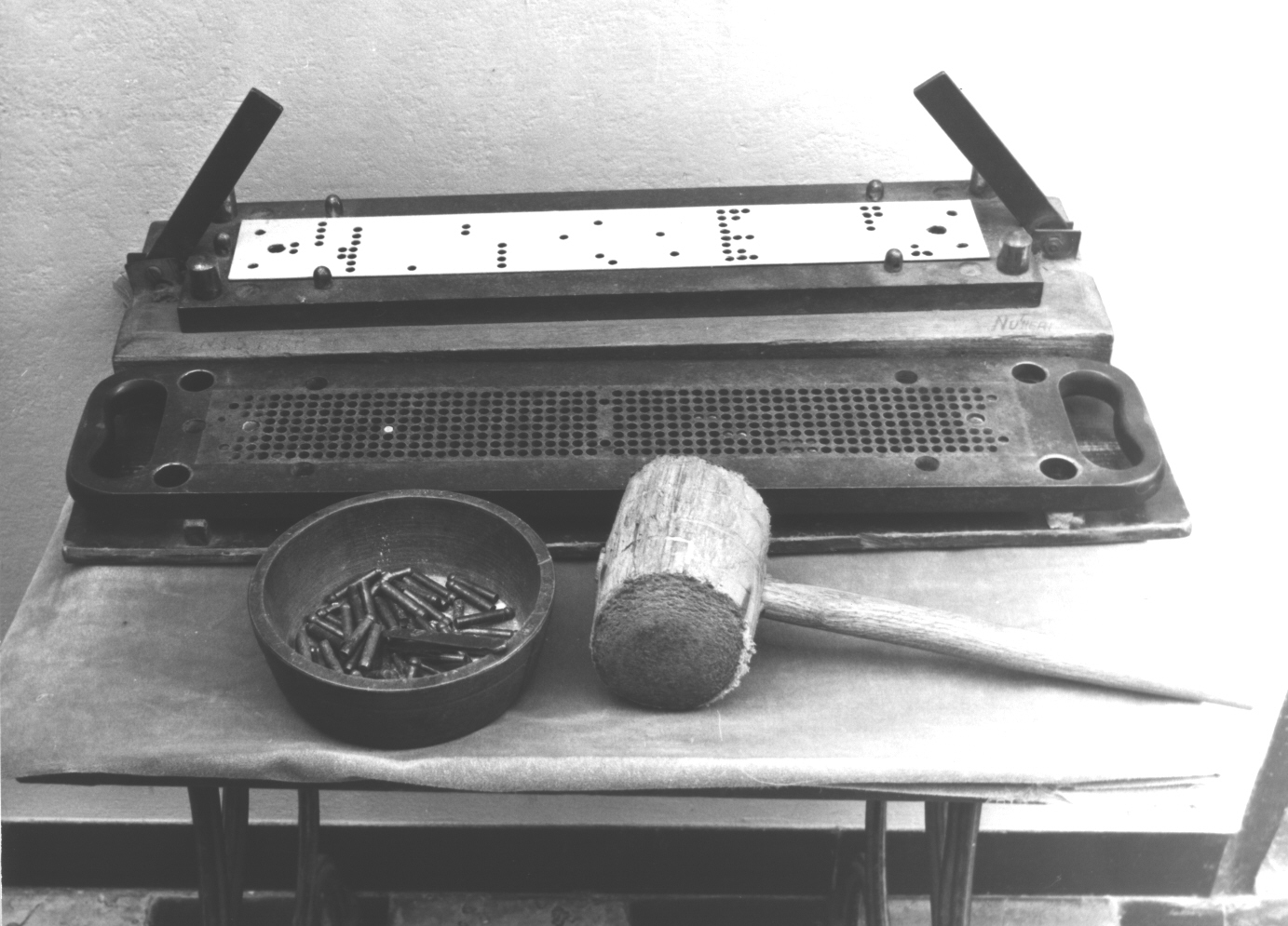 - FUNZIONE E MODALITÀ D'USO Serve per preparare le schede perforate per la JacquardSi inserisce la scheda di cartone tra le due lastre e, inserendo dei punzoni nei fori secondo il disegno della messa in carta, si ottiene lo schema della Jacquard. I punzoni vengono battuti con un'apposita mazza di legno