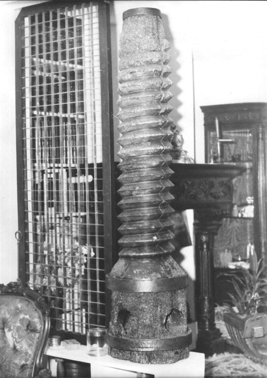 - NOTIZIE STORICO CRITICHE Questa vite faceva parte di un torchio a madre vite del tipo ancora tutto di legno. Il funzionamento era questo: si mettevano le vinacce, ancora inzuppate di mosto e inumidite con acqua nella gabbia del torchio, che è sempre costruita di legno molto resistente , sopra la catasta di vinacce si mettevano alcuni grossi blocchi di legno, che permettono alla vite di trovare un appoggio all'altezza giusta. Messi i ceppi si comincia a torcere con una stanga che passa per la vite, aiutando spesso lo sforzo con un argano. Il vino torchiato cola dalla gabbia nell' "inferno", dove è stato posto il mastello per raccogliere il vino. Per costruire le viti del torchio ci voleva un'abilità artigianale notevole: esistevano addirittura artigiani specializzati in questa produzione che giravano con un carro pieno di queste viti da torchio