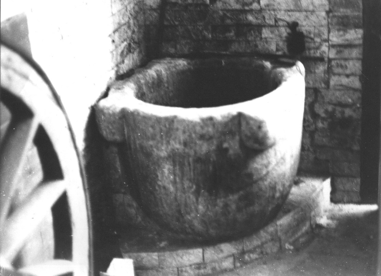 Mortaio di marmo di grosse dimensioni, incastrato tra due pareti in un angolo, sopra un basamento di pietra. Superficie esterna molto levigata, ha forma semi ovoidale, è dotato di quattro grosse anse in marmo a coppie simmetriche, disposte nella fascia superiore esterna