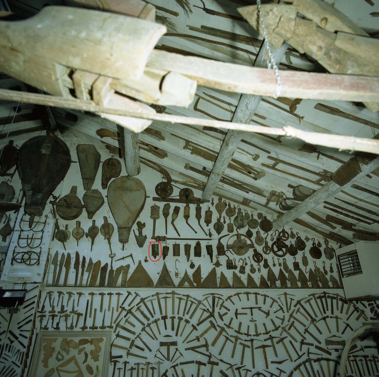 A forma rettangolare. L'oggetto è costituito da un tubo di latta o caminetto, un lato è chiuso mentre sull'altro vi è innestato un tronco di cono. Il mantice che si trova al di sotto del caminetto soffia aria all'interno dello stesso tramite un foro