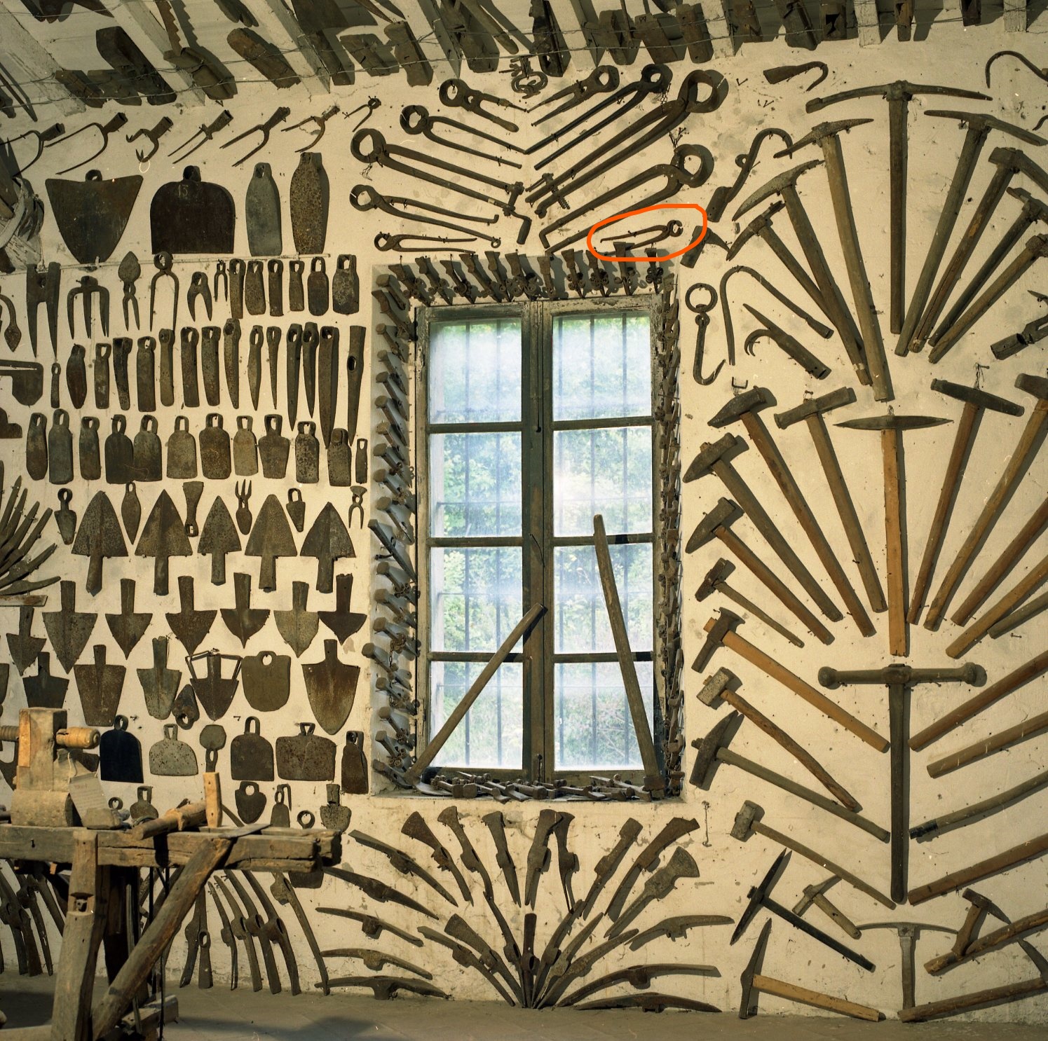 Meccanismo a doppia leva paragonabile a quello della forbice o della pinza e costituito da due lunghi manici e due ganasce arcuate. L'insieme forma, con anche altri oggetti, due file verticali a lisca di pesce e è costituito dall'ultimo oggetto dall'alto in entrambe le file