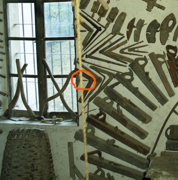 - NOTIZIE STORICO CRITICHE L'oggetto è posto in quella che Guatelli chiama "parete degli attrezzi per la lavorazione del legno" o "parete del falegname". Lo stesso Guatelli spiega che anche il contadino possedeva necessariamente alcuni attrezzi da falegname e alcuni fortunati anche "le trivelle per farsi le scale e i carri e il succhiello", però "sempre spuntati" (1999). La differenza tra il succhiello e la trivella è tutta nella punta. Il primo, avente punta conica e a un tagliente longitudinale elicolidale, crea buchi conici adatti al successivo inserimento, ad esempio, di viti, il secondo, avente punta cilindrica con due taglienti orizzontali in testa, crea fori cilindrici adatti ad esempio all'inserimento dei pioli della scala. Fonti di documentazione 3/4