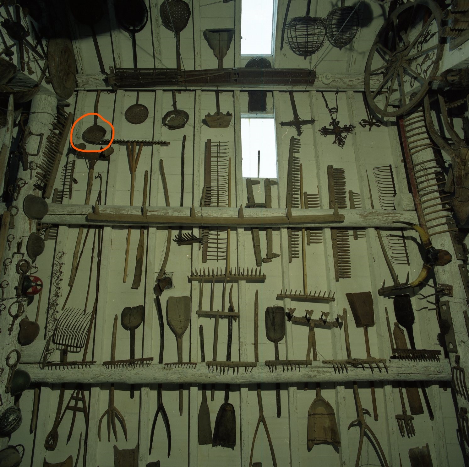Tegame largo e basso con fondo bucarellato e manico grossolano in legno ricavato direttamente da un ramo solo decortecciato