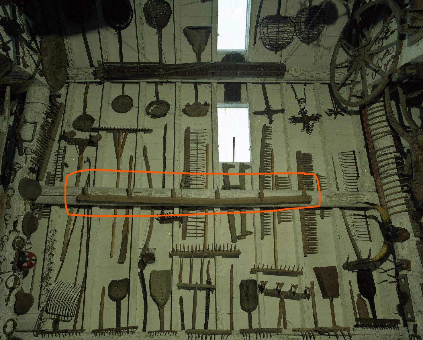 Traversa con denti molto radi. Sul lato della traversa opposto ai denti ci sono due fori in cui andava inserita l'impugnatura, in parte ancora visibile