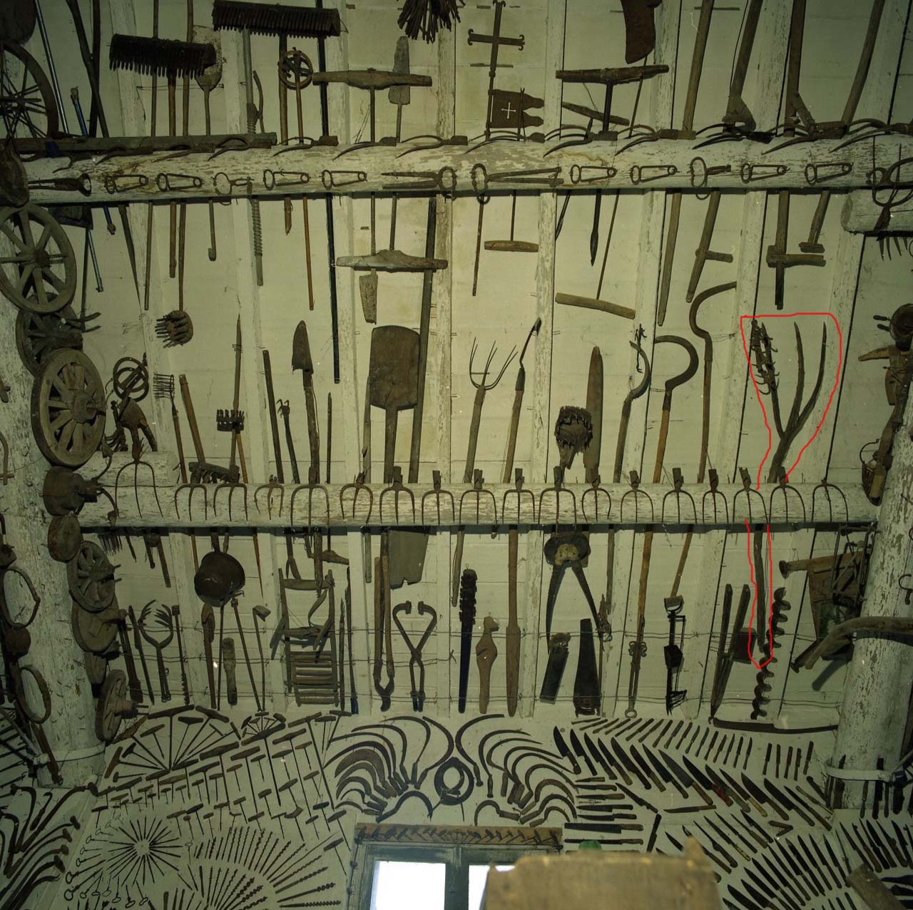 Lungo bastone terminante con tre rebbi. Disposte, tra i travicelli del tetto, miste a falci per rimuovere il sottobosco e ad altri utensili, a ridosso dell'arcareccio