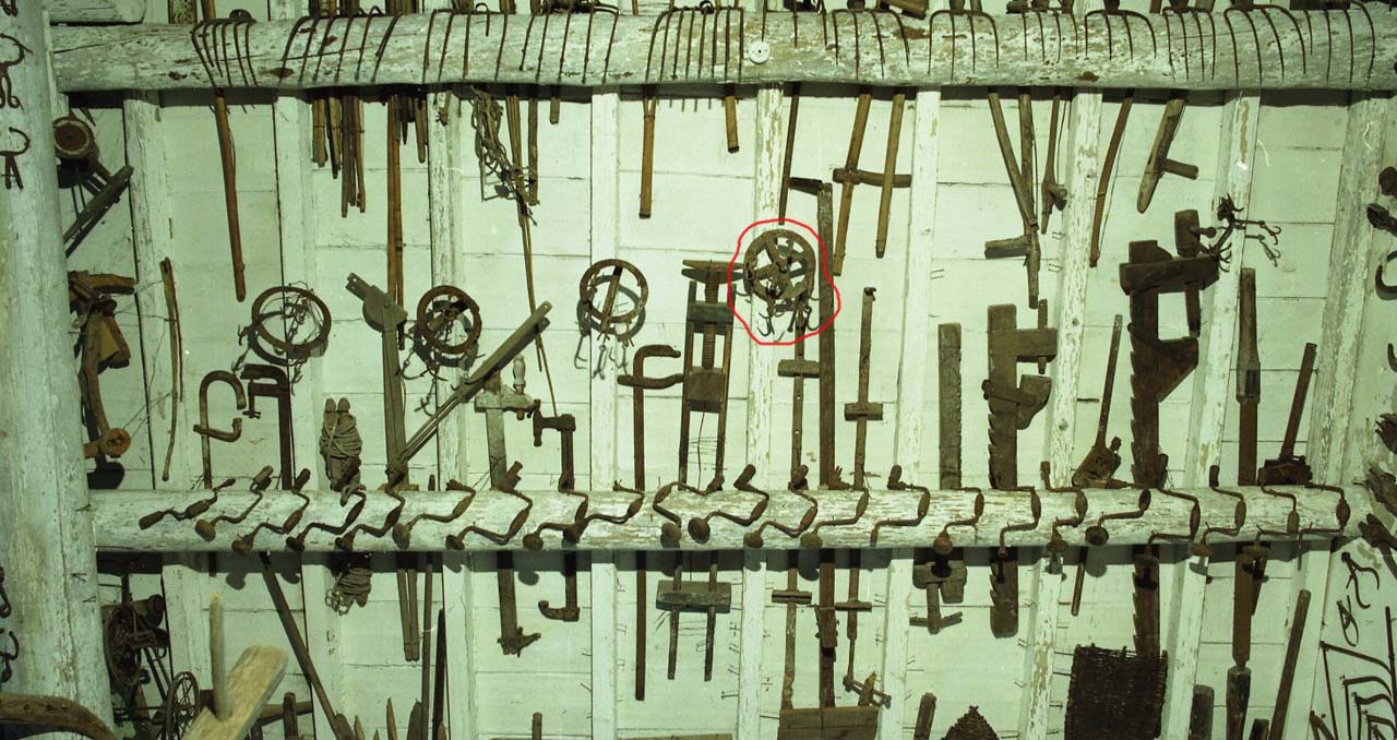 A forma circolare. Il supporto è formato da un lamella circolare con quattro raggi. In ogni punto di incontro dei raggi con la circonferenza è saldata un breve catena terminante con un uncino a due punte. Un uncino ulteriore è presente anche al centro del cerchio per un totale di cinque. Sempre al centro del cerchio, sul lato opposto agli uncini, sono saldati una serie di anelli che offrono il supporto per l'aggancio della corda o della catena del pozzo