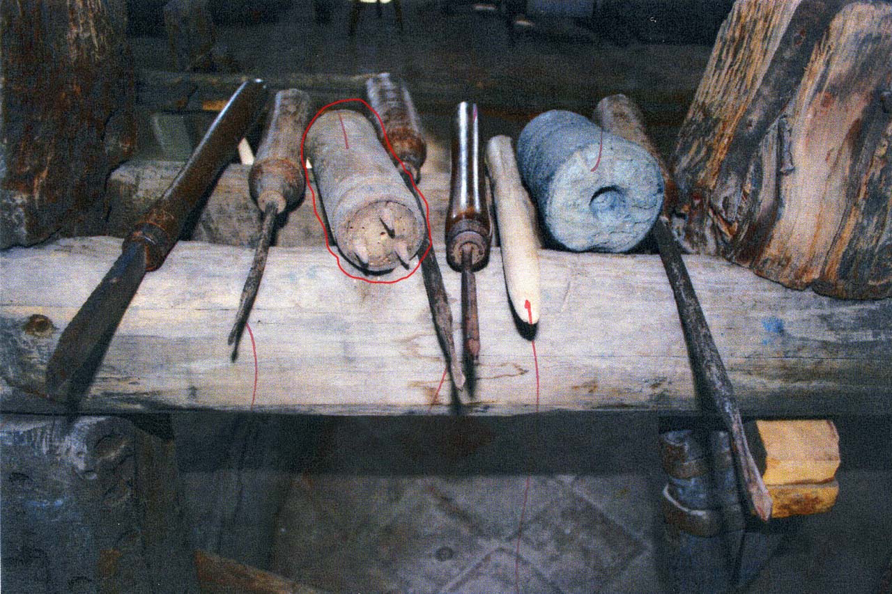 A forma di cilindro. Il pezzo presenta su di una base una piastra metallica rotonda con infisse tre punte. Lungo la supefice laterale sono presenti delle zigrinature