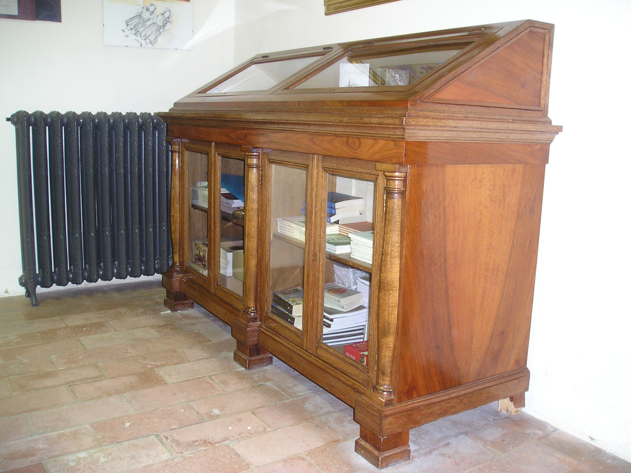 credenza composta da una base rettangolare rialzata da terra mediante sei zoccoli a pianta quadrangolare, che individua due vani distinti. L'interno è diviso da due ripiani, chiusi da due antine. Agli angoli e a metà della struttura sono presenti colonne tornite. La parte superiore della base termina con una vetrinetta con sezione trasversale rettangolare