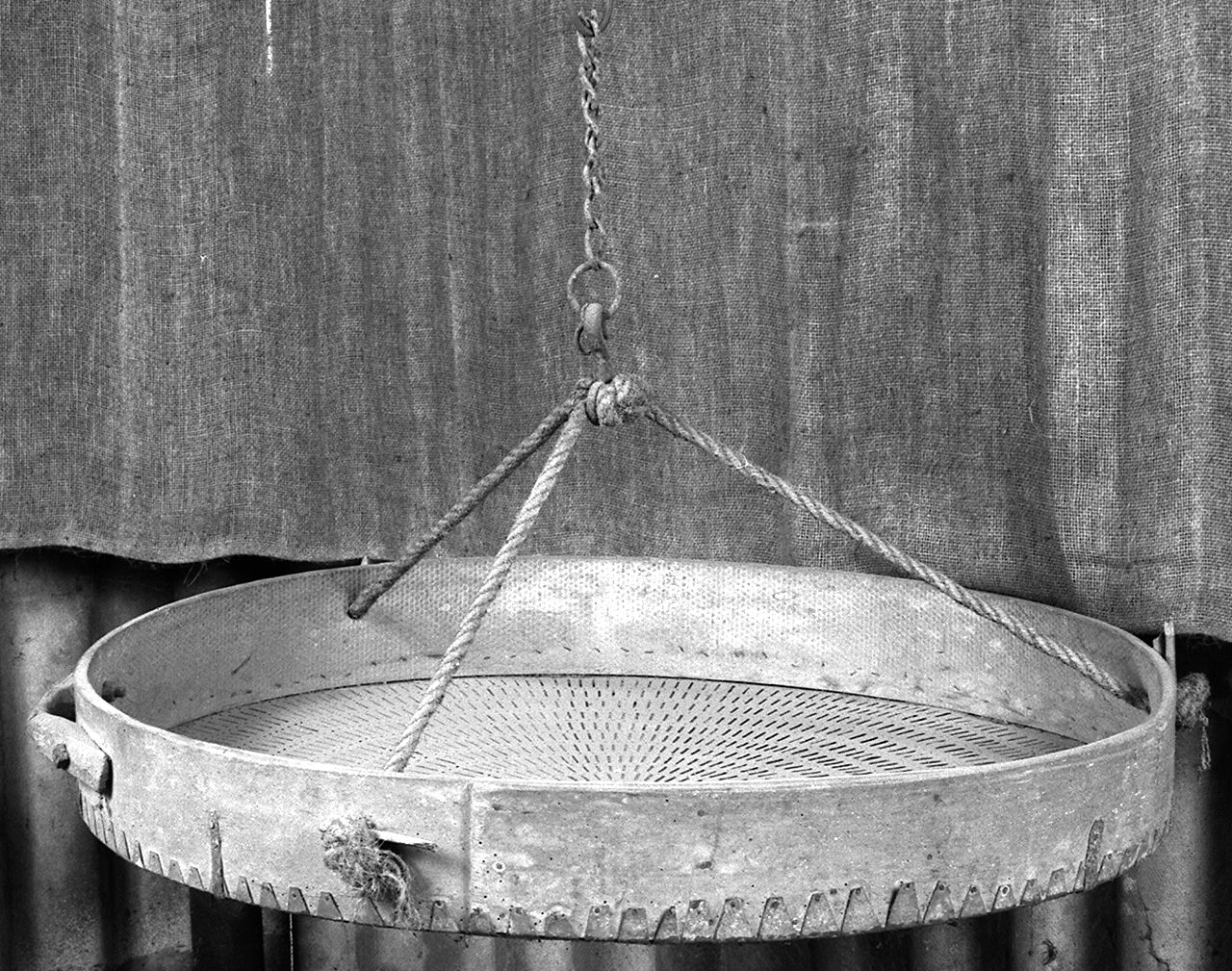 - FUNZIONE E MODALITÀ D'USO mondare, dividere il grano dalla pagliaappeso alla parete tramite funi, viene posto del grano all'interno quindifacendo vento dal basso e impugnato con le mani per il manico viene agitato in modo da far volare la paglia ("pula") e dividerla dal grano