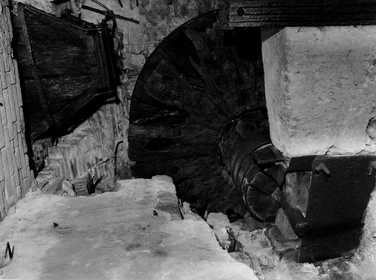 - FUNZIONE E MODALITÀ D'USO convogliare l'acqua dal bottaccio alla ruotaL'acqua proveniente dal bottaccio entrava nella tromba; la forma tronco pi ramidale rovesciata di quest'ultima consentiva all'acqua, durante la cadut a, di scorrere sulle pareti interne e di aumentare la velocità. La ruota s ottostante era messa in movimento per effetto dell'azione combinata del p e so dell'acqua e della sua forza d'urto. Alla base della tromba, una last ra scorrevole manovrata da un sistema di leve aveva la duplice funzione di regolare la portata dell'acqua o di chiudere la t