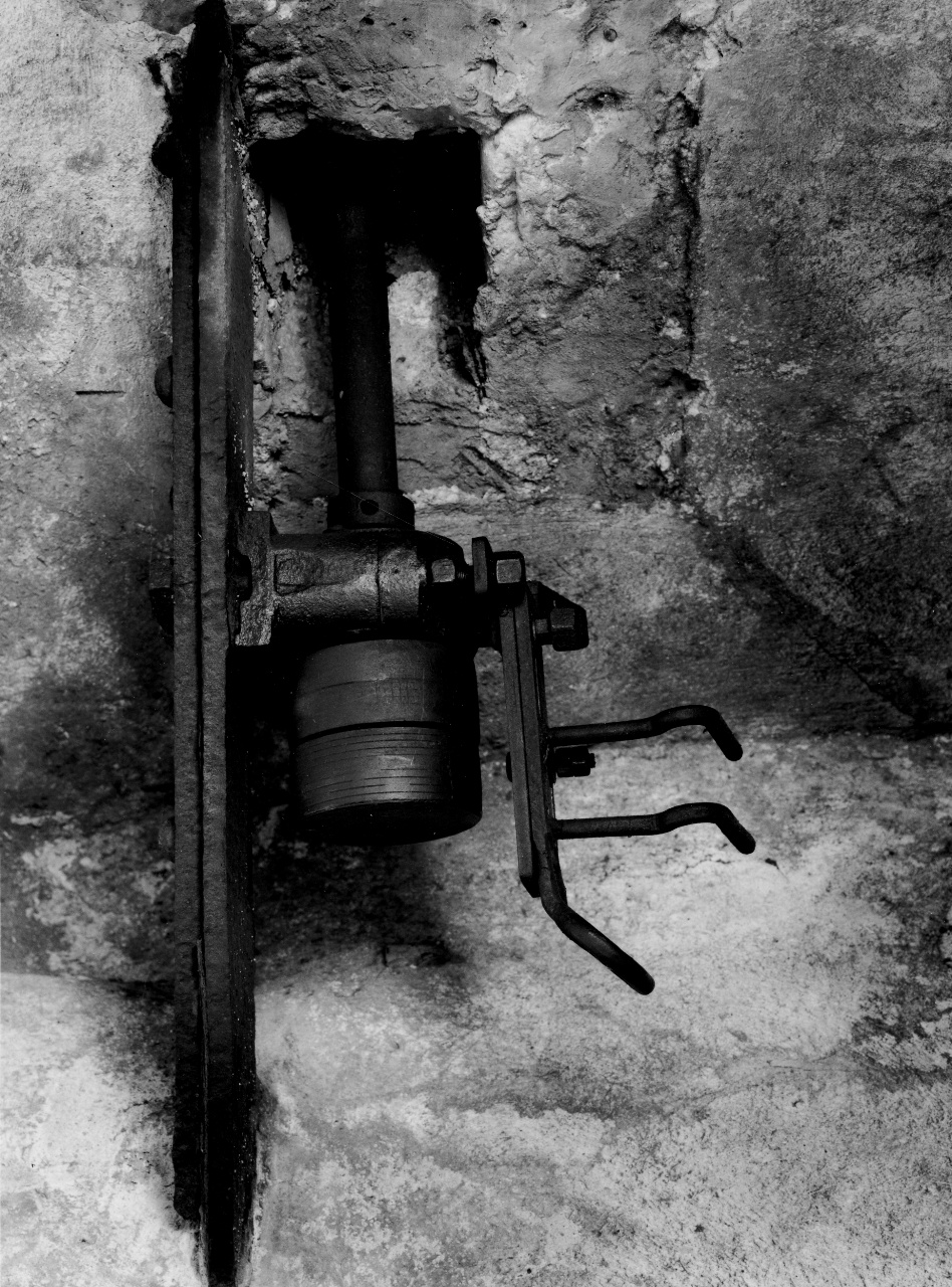 Mola naturale a disco, ruotante su un asse di acciaio; quest'ultimo, attra verso il muro,è collegato all'interno della ferriera dove un sistema di p ulegge collegate all'albero di trasmissione forniva il movimento alla mo la esterna