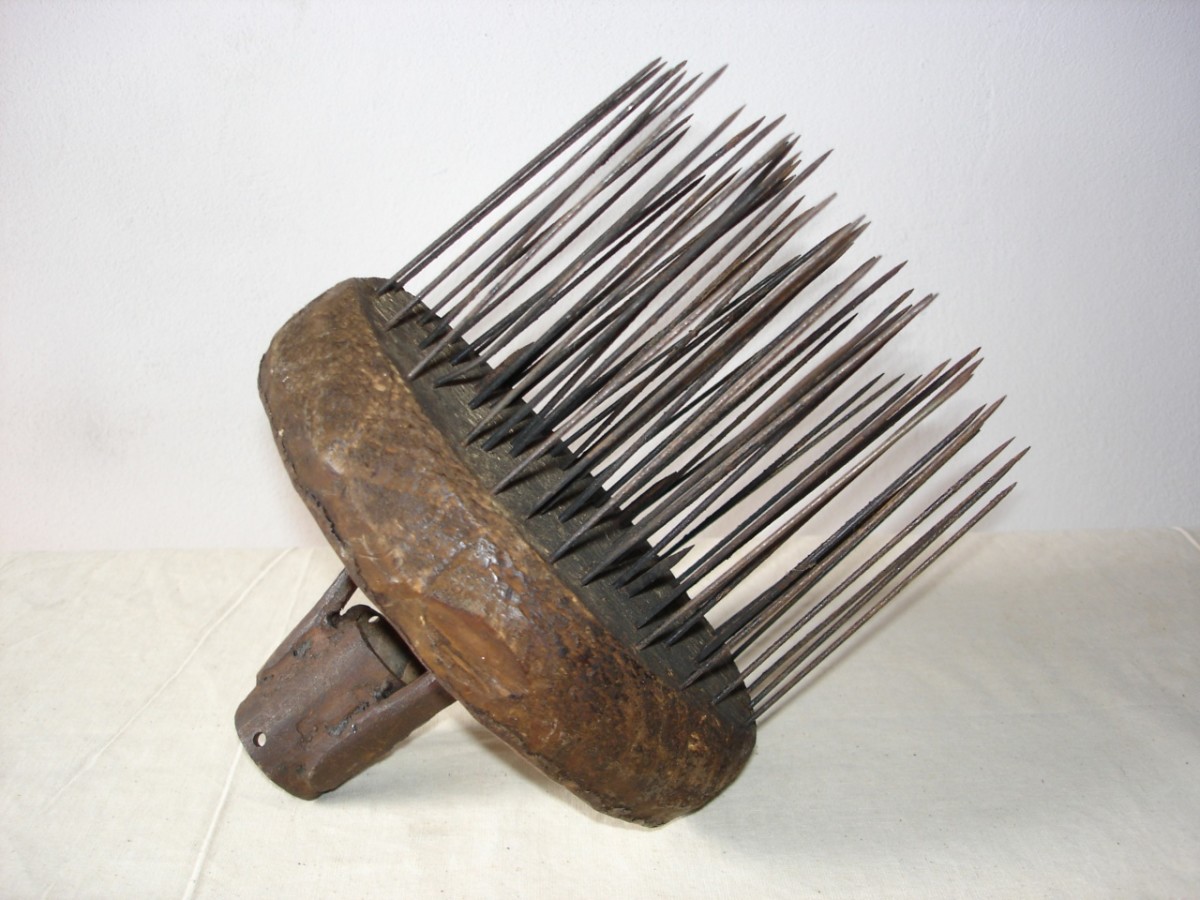 l'oggetto si compone di una base circolare in legno in cui sono state inserite numerose stecche appuntite. Sul lato opposto alle stecche è fissato con quattordici chiodi un disco di latta rafffigurante un edificio sotto cui, in bianco con fondo rosso, è presente il nome di una ditta. Sopra il disco di latta è fissato un supporto in ferro cilindrico i cui tre poiedi sono fissati con tre chiodi alla base