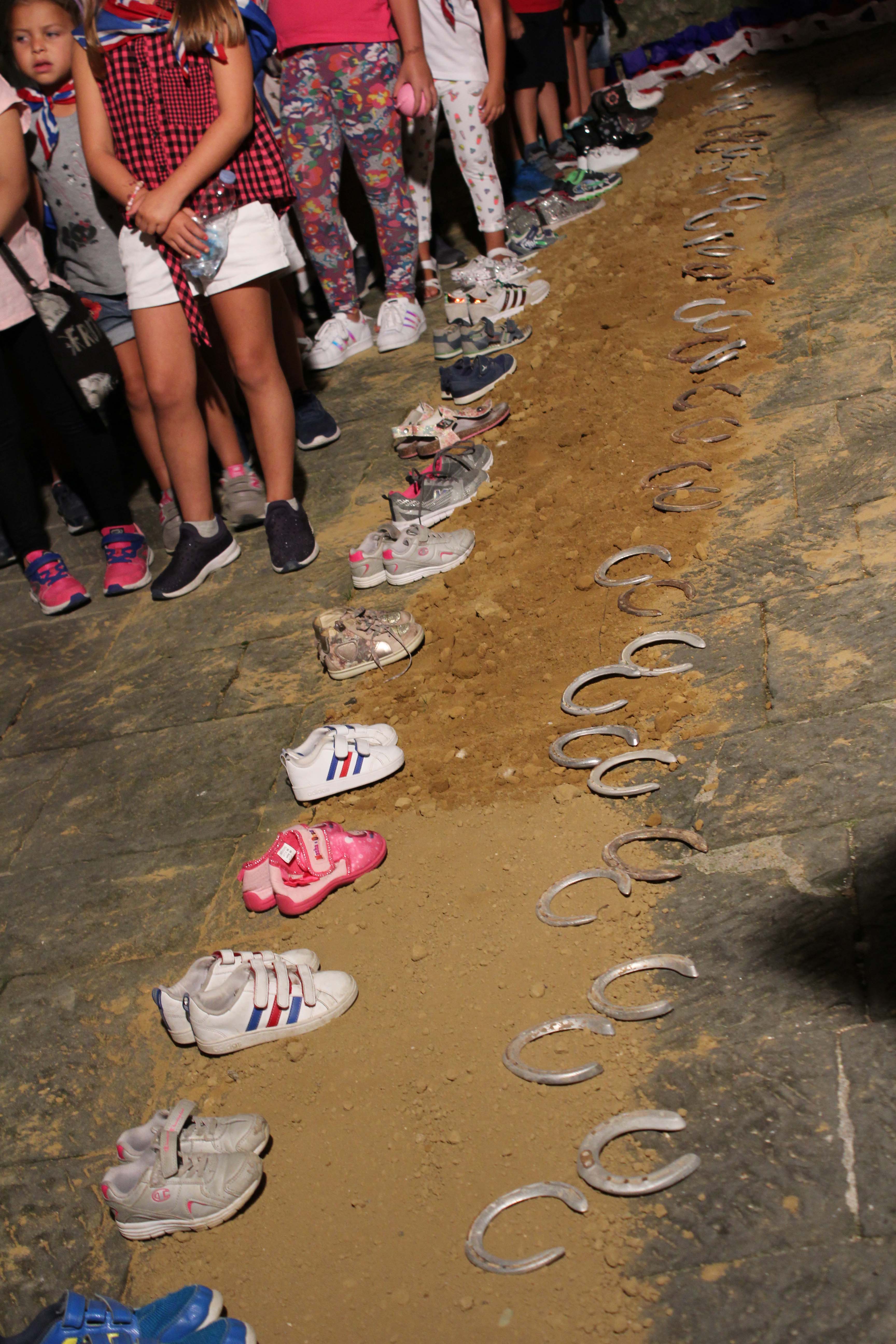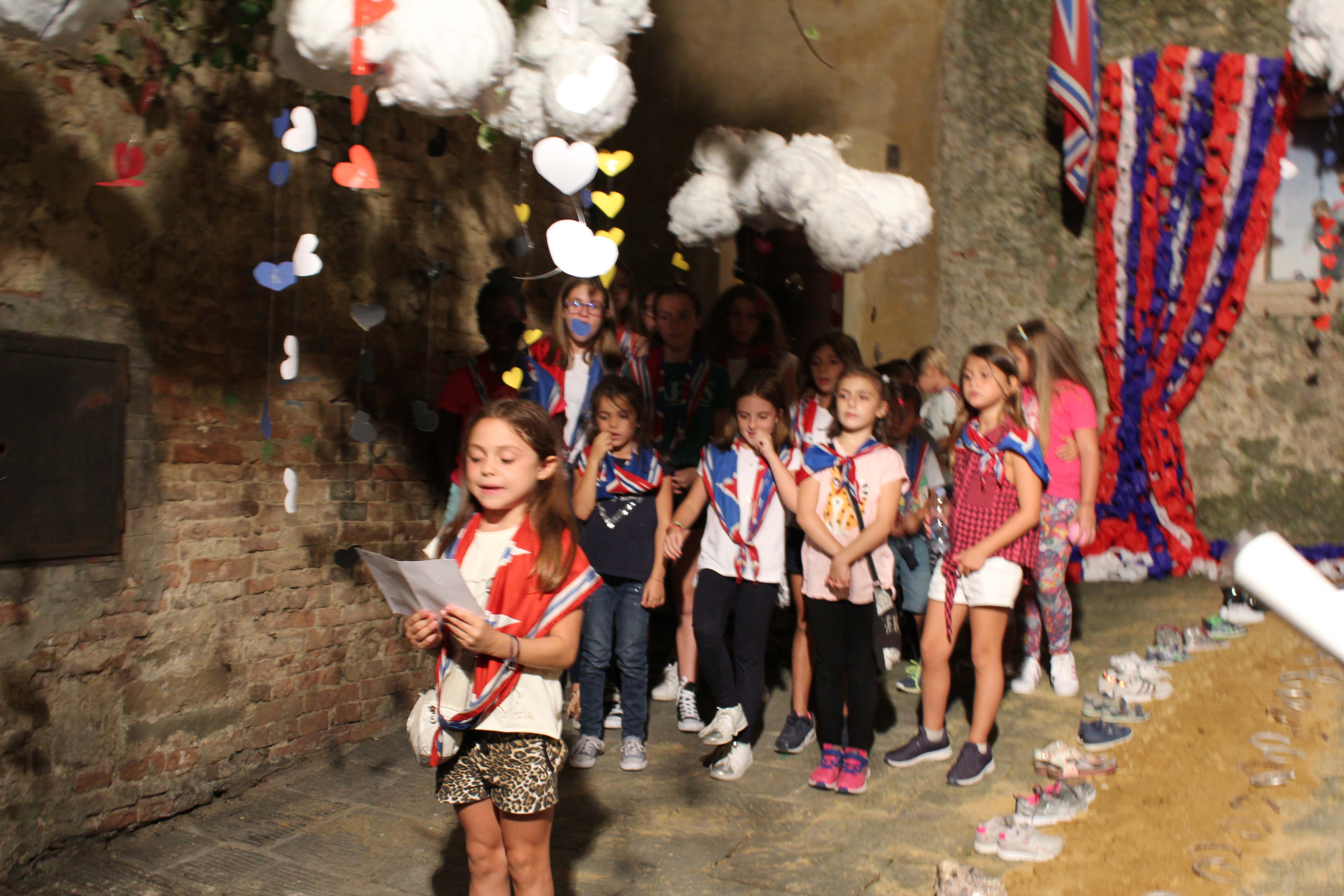 Il tabernacolo è decorato dai bambini, coordinati dagli adulti, con i colori della contrada. Tornano, a identità della città tutta, elementi legati alla competizione del Palio: la terra e i ferri di cavallo. Protagonisti sono i bambini che attorniano il tabernacolo e lo hanno decorato, coordinati dagli adulti. Nei bambini si incanala la tradizione contradaiola, divenendo il mezzo per la sua continuazione