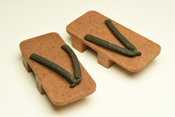 Paio di sandali con suola di legno, tomaia costituita da due fasce in corda rivestite di tessuto unite al vertice a formare l'infradito, fermate sul lato inferiore dalla suola con piastra in metallo