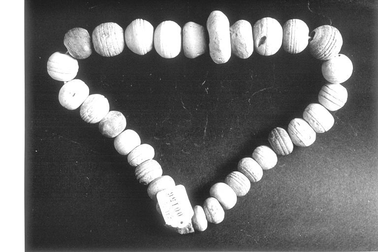 Quasi tutte le fusarole hanno forma circolare schiacchiata ai poli. Due presentano una forma troncoconica. Alcune mostrano delle semplici scanalature parallele sul bordo esterno. Per evitarne la dispersione, sono tenute insieme con dello spago a formare una collana