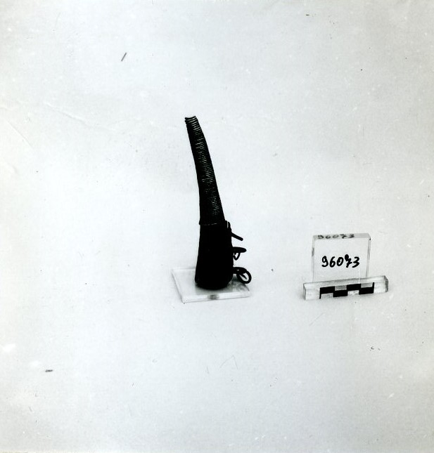 Piccolo fischietto formato da due sezioni curve semicilindriche unite insieme e rivestite di filamenti di stagno nella parte mediana e bassa e di pelle di rettile nella parte superiore. Vi è poi una piccola fascia i cui bordi sono cuciti con legature vegetali. Alla pelle, sopra la cucitura, sono infissi tre anellini in ottone da uno dei quali ne pende un quarto più piccolo