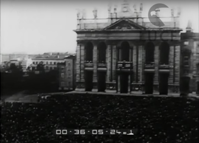 L'immagine della Madonna del Divino Amore viene esposta sull'altare della chiesa di Sant'Ignazio. Un'ammalata adagiata su una barella viene fatta sostare ai suoi piedi. Fedeli ed ecclesiastici sono riuniti in preghiera o con funzione assistenziale dietro la balaustra. Il parroco con un chierichetto distribuisce l'eucarestia. Il corteo di fedeli in processione trasporta su un camioncino l'immagine della Madonna del Divino Amore, sormontata da sontuosi drappi e da una corona. Intorno all'effigie è stata collocata una moltitudine di fiori. Un gruppo di ecclesistici in piedi sui predellini dell'autocarro accompagnano la Madonna. Numerose giovani donne con il capo velato accompagnano la Madonna recando gigli bianchi tra le mani. Il corteo giunge a piazza Venezia, davanti all'Altare della Patria. La folla saluta festante l'immagine della Vergine sventolando delle bandierine. Alcuni militari a cavallo accompagnano la folla. La processione giunge infine presso la basilica di San Giovanni in Laterano. Dalla loggia della basilica viene impartita la benedizione a centinaia di fedeli che rispondono sventolando fazzoletti bianchi
