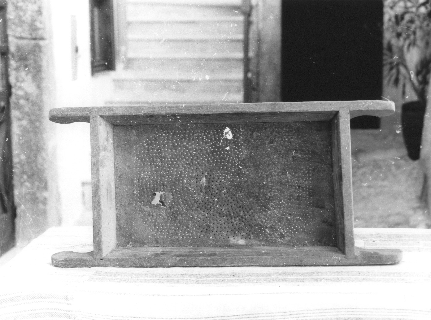 Telaio in legno provvisto di quattro manici sagomati con una lamiera con fori di mm. 1, situata nella parte sottostante e retta da un controtelaio