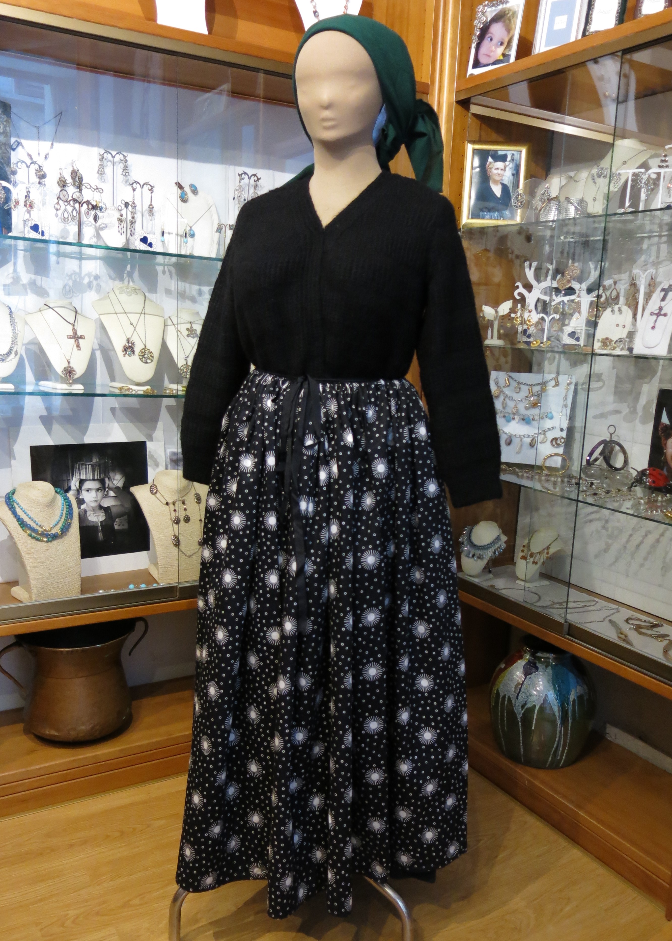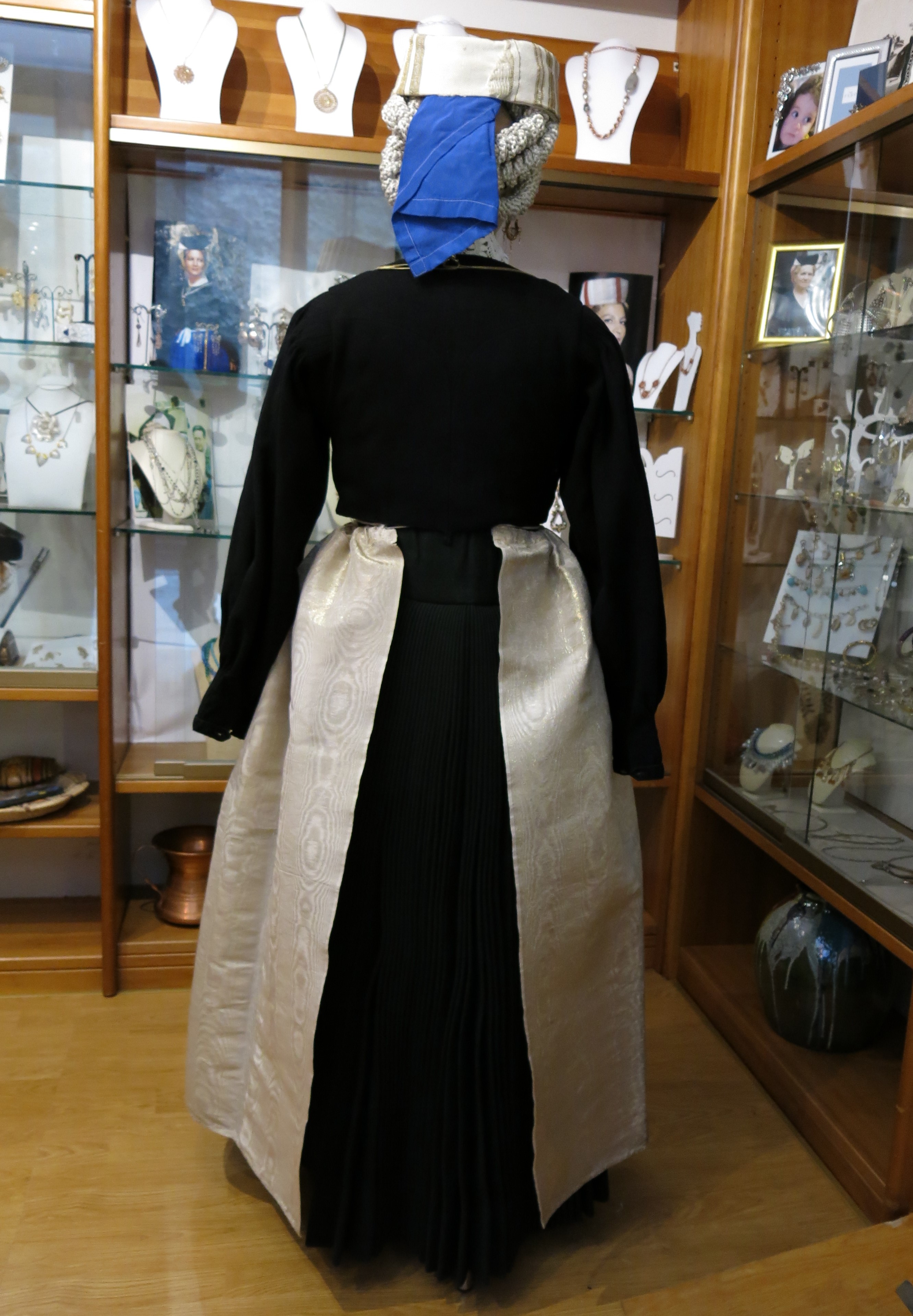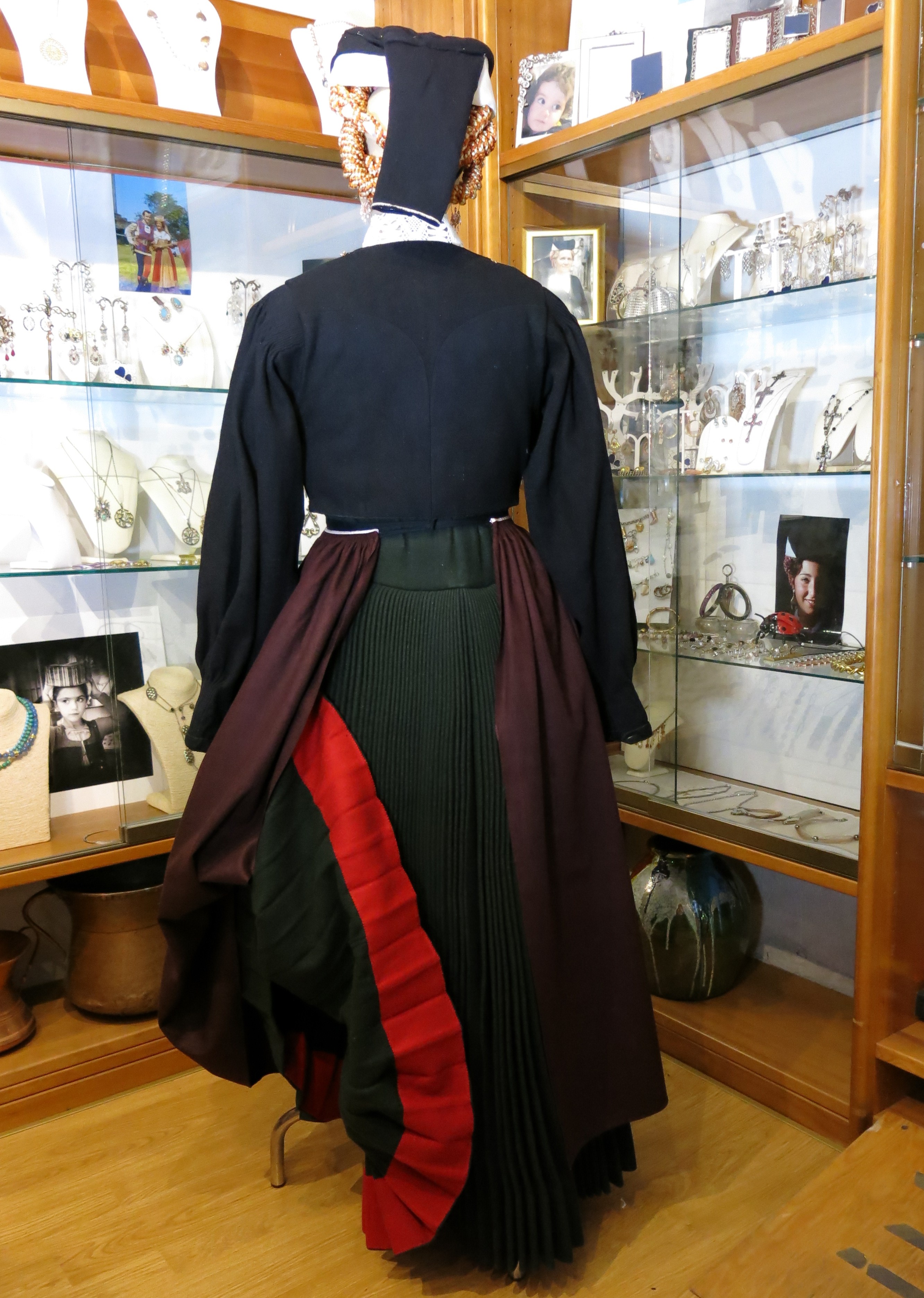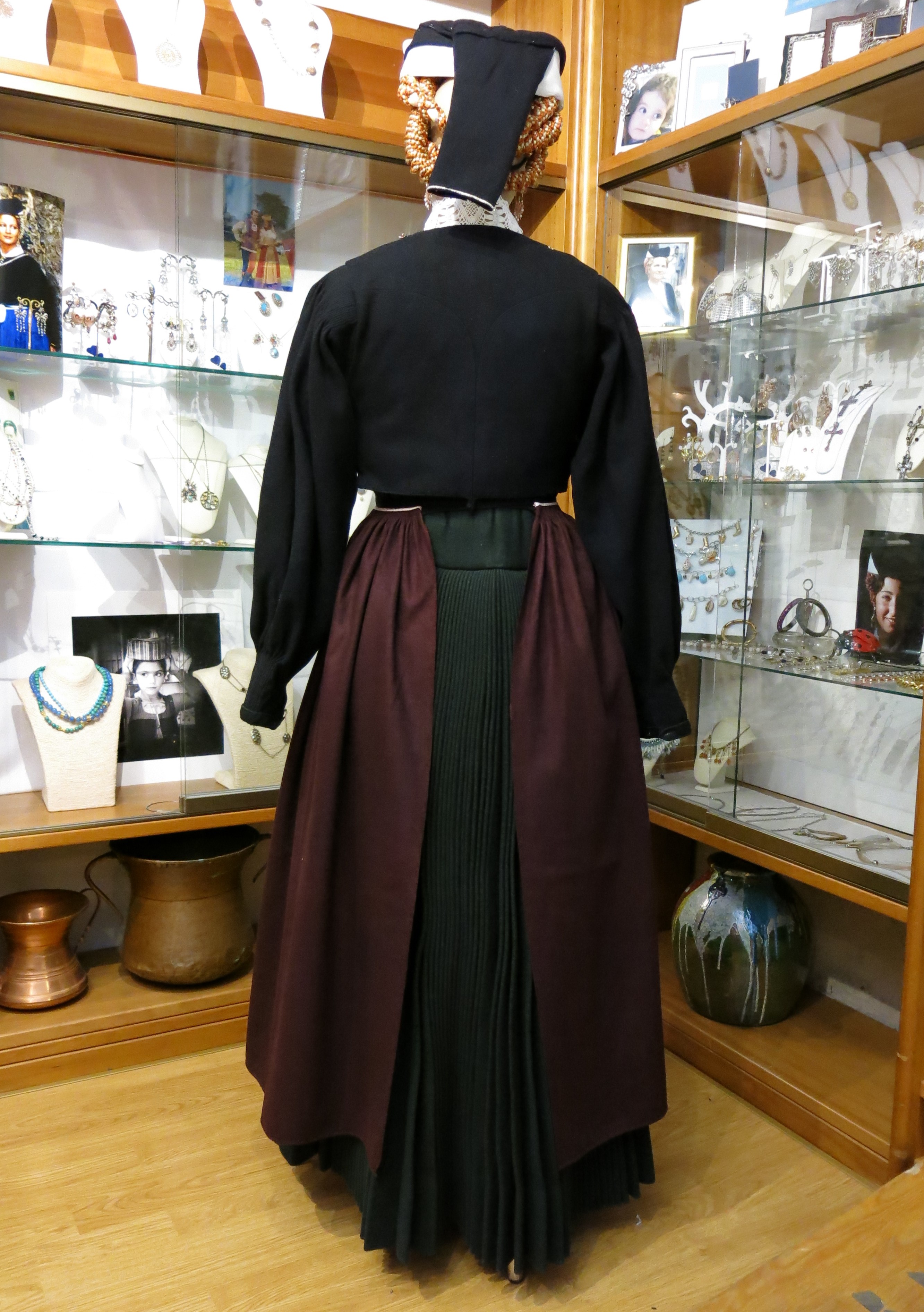 Abito femminile composto da 5 elementi: una gonna di colore verde scuro, formata da diversi teli di panno di lana cuciti parallelamente, lunga fino alla caviglia e con una striscia interna scarlatta, detta #pedera#, fissata nella parte finale; un grembiule in lana bordeux, detto #mantera#, della stessa lunghezza della gonna, legato in vita così da coprirne totalmente la parte frontale e parzialmente quella posteriore; un giubbino girocollo di panno di lana nero, detto #comodino#, chiuso frontalmente da bottoni d'argento decorato e a maniche lunghe; un colletto bianco, realizzato a tombolo, detto #scolla#; un copricapo, detto #cappellitto#, di colore nero e bianco posizionato sul capo e con un lembo più lungo nella parte posteriore. Al #cappellitto#, inoltre, sono agganciati dei cordoni di seta di colore arancione e giallo, annodati ed intrecciati tra loro. Il costume è ornato da un paio di orecchini pendenti e da una collana con un grande ciondolo rotondo, al cui interno sono raffigurati due cuori circondati da raggi solari stilizzati