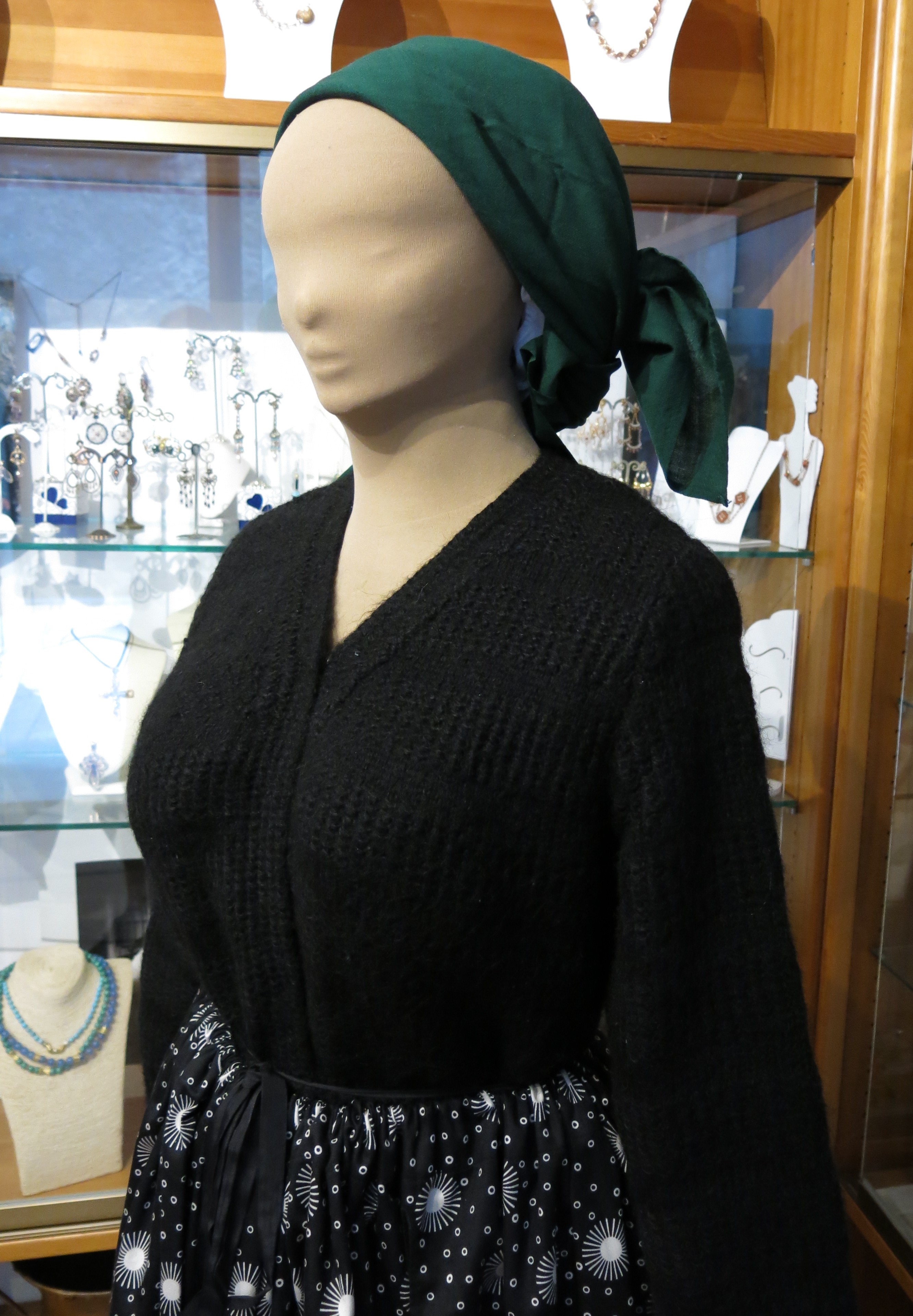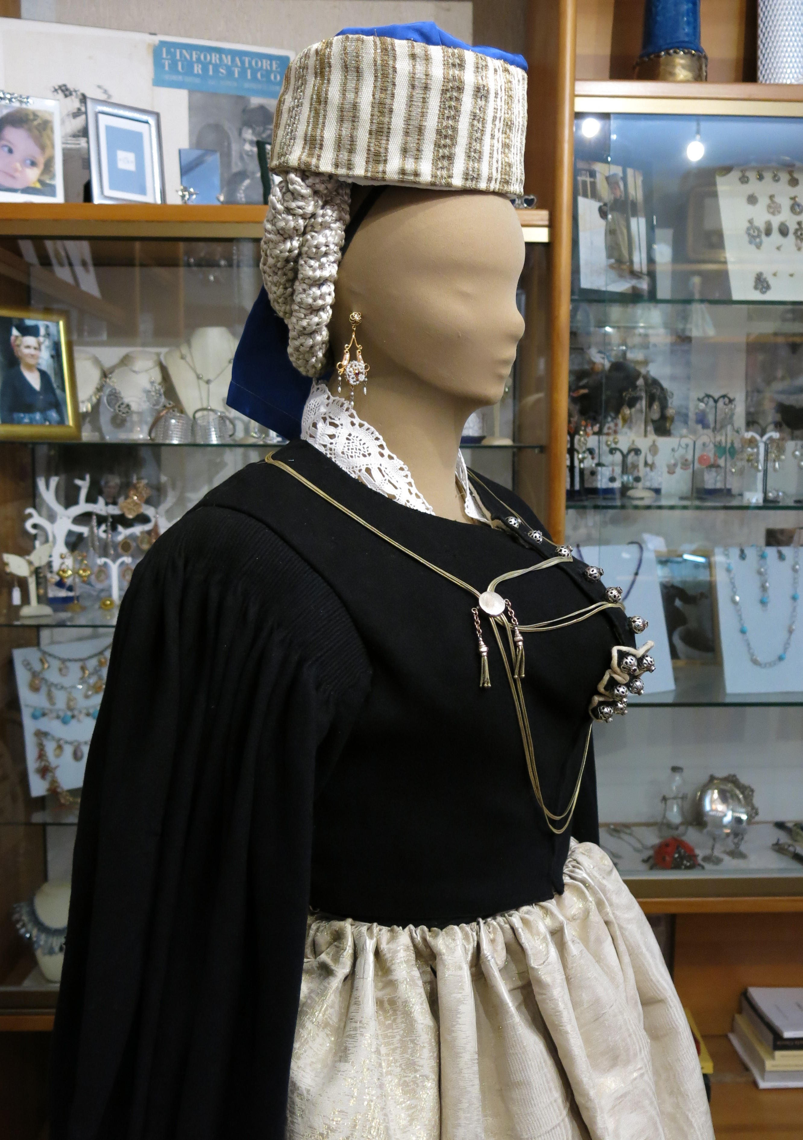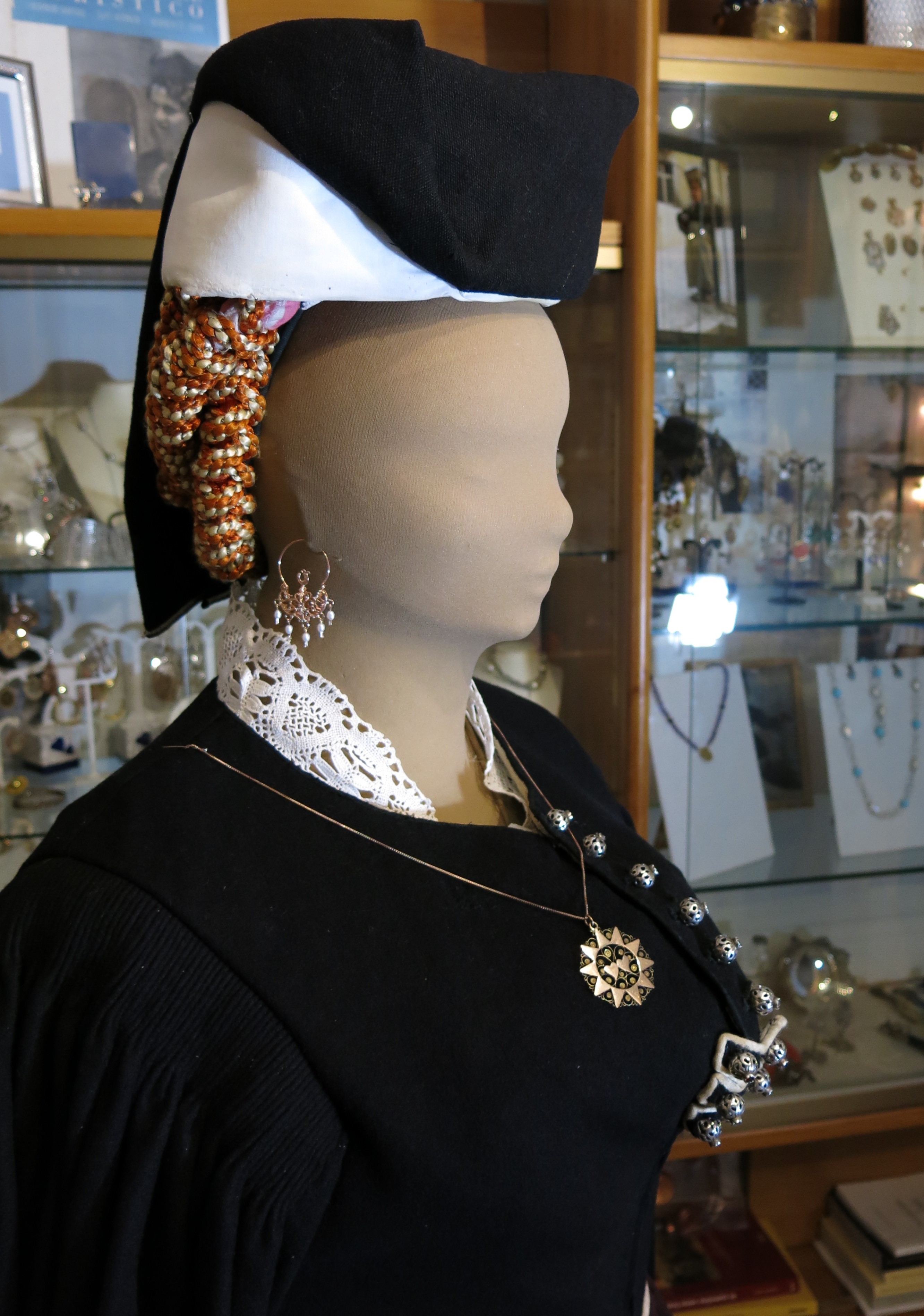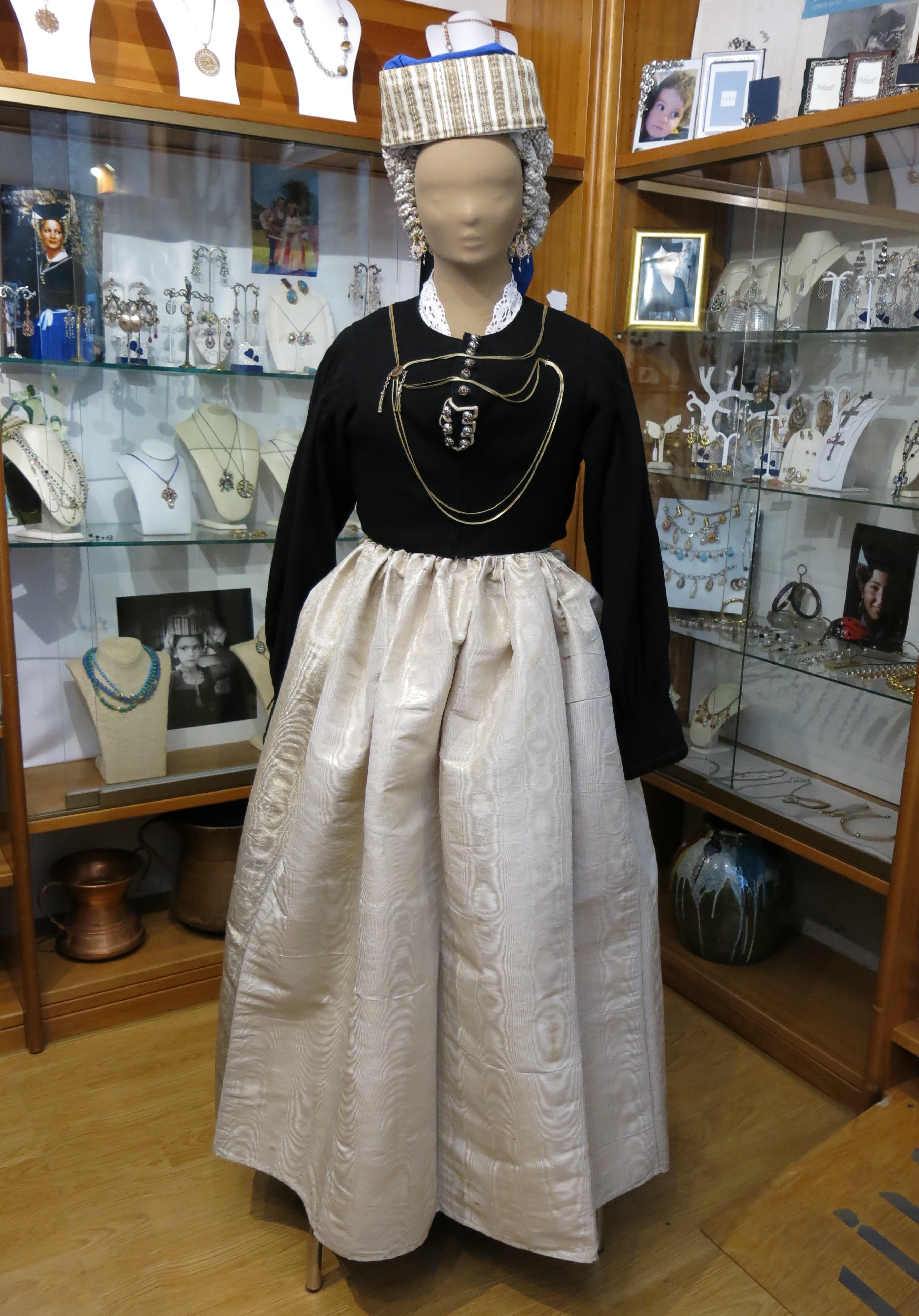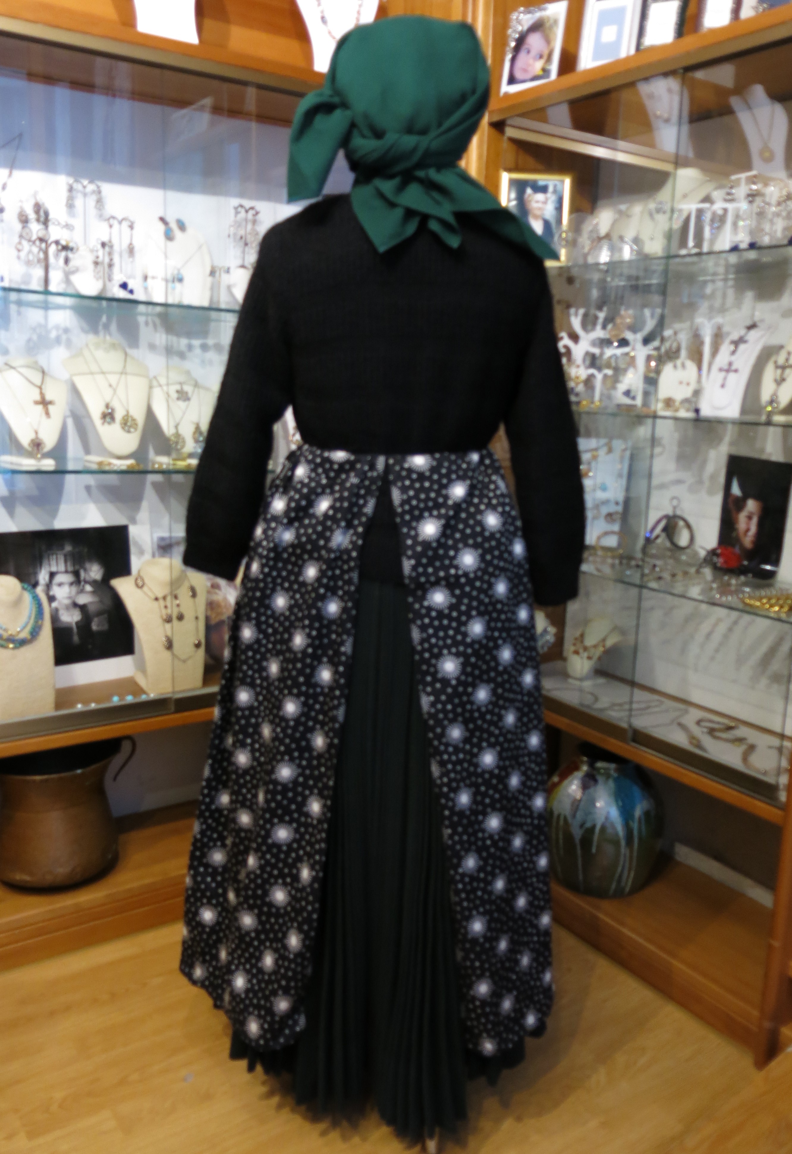 Abito femminile composto da 5 elementi: una gonna di colore verde scuro, formata da diversi teli di panno di lana cuciti parallelamente, lunga fino alla caviglia e con una striscia interna scarlatta, detta #pedera#, fissata nella parte finale; un grembiule in lana bordeux, detto #mantera#, della stessa lunghezza della gonna, legato in vita così da coprirne totalmente la parte frontale e parzialmente quella posteriore; un giubbino girocollo di panno di lana nero, detto #comodino#, chiuso frontalmente da bottoni d'argento decorato e a maniche lunghe; un colletto bianco, realizzato a tombolo, detto #scolla#; un copricapo, detto #cappellitto#, di colore nero e bianco posizionato sul capo e con un lembo più lungo nella parte posteriore. Al #cappellitto#, inoltre, sono agganciati dei cordoni di seta di colore arancione e giallo, annodati ed intrecciati tra loro. Il costume è ornato da un paio di orecchini pendenti e da una collana con un grande ciondolo rotondo, al cui interno sono raffigurati due cuori circondati da raggi solari stilizzati
