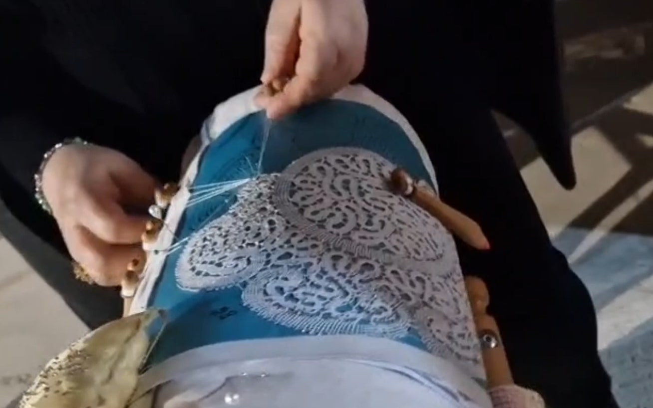 La donna è seduta e tiene poggiato sulle ginocchia, con l'aiuto di un supporto, un tombolo di colore bianco. Sul tombolo è fissato un modello disegnato su carta celeste traslucida, al quale sono appositamente posti degli spilli, che viene seguito dalla donna durante la creazione del merletto. Il filo bianco viene annodato formando il merletto tramite la manovra di fuselli in legno; su di essi è arrotolato l'altro capo del filo, di volta in volta tirato o allentato. La donna, con entrambe le mani, utilizza alternatamente due coppie di fuselli e con il movimento e la sovrapposizione dei fili sugli spilli crea i nodi della struttura