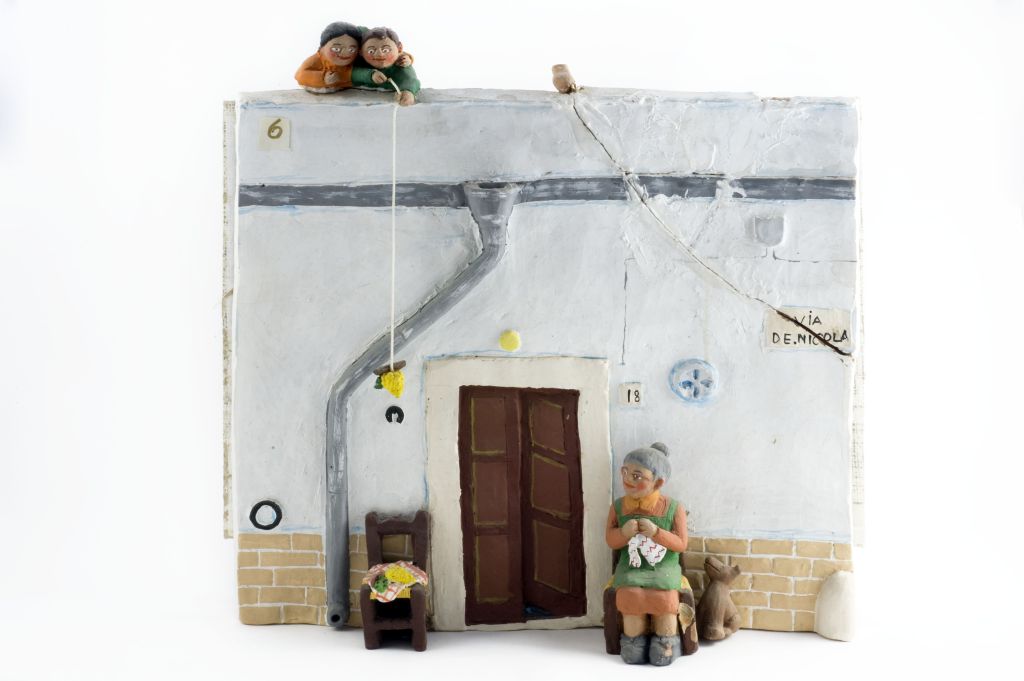 la scultura raffigura due bambini nell'atto di burlarsi di un'anziana donna. La donna siede su una sedia, davanti l'ingresso di casa, nell'atto di lavorare a maglia con i ferri; indossa un vestito arancione con sopra un grembiule verde, ai piedi ha grandi pantofole, vicino è seduto un cane. Accanto la porta di casa è presente una sedia con frutta. I due bambini sono sopra l'abitazione, reggono in mano un filo con sospeso un grappolo di uva dipinto di giallo nell'atto di rubare la frutta presente sulla sedia. E' d'uso, infatti, porre frutta ed ortaggi su sedie d'avanti le case per indicarne la disponibilità e, quindi, la vendita. Completa la figura un ferro di cavallo applicato sulla destra dell'uscio, il numero civico, la canaletta di scolo dell’acqua, una lampadina e la targhetta recante la scritta VIA DE NICOLA. Il dispositivo sonoro tubolare, a forma più o meno cilindrica, è applicato all'apice, sull'edificio