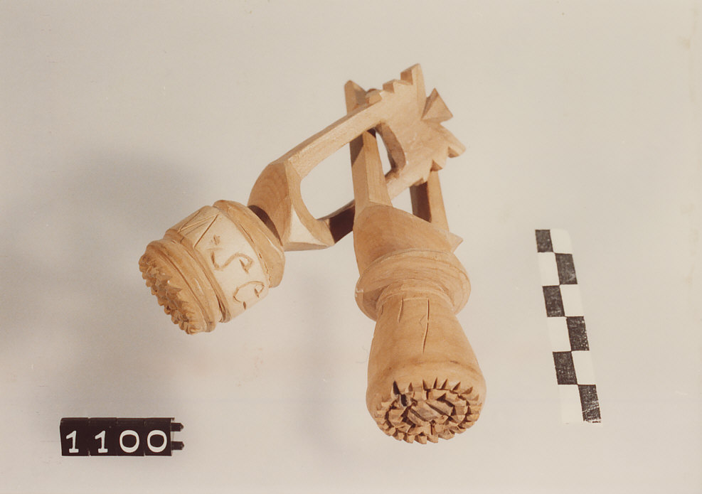 Due timbri solidali tra loro, ciascuno costituito da un corpo sagomato a sezione circolare con manico e intagli sul fondo