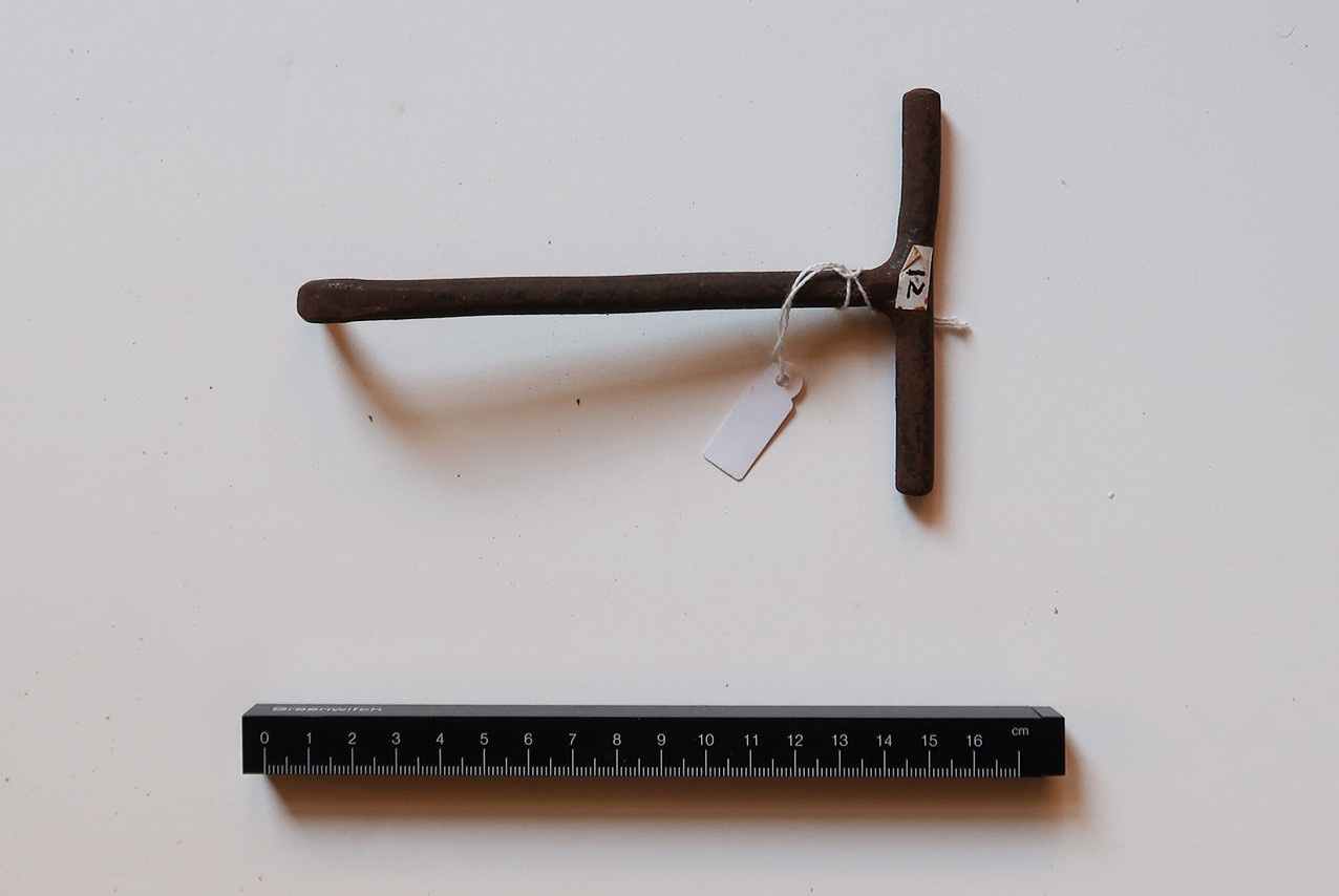 Strumento metallico con forma a T, di sezione circolare con l'estremità del braccio lungo uncinata e scanalata