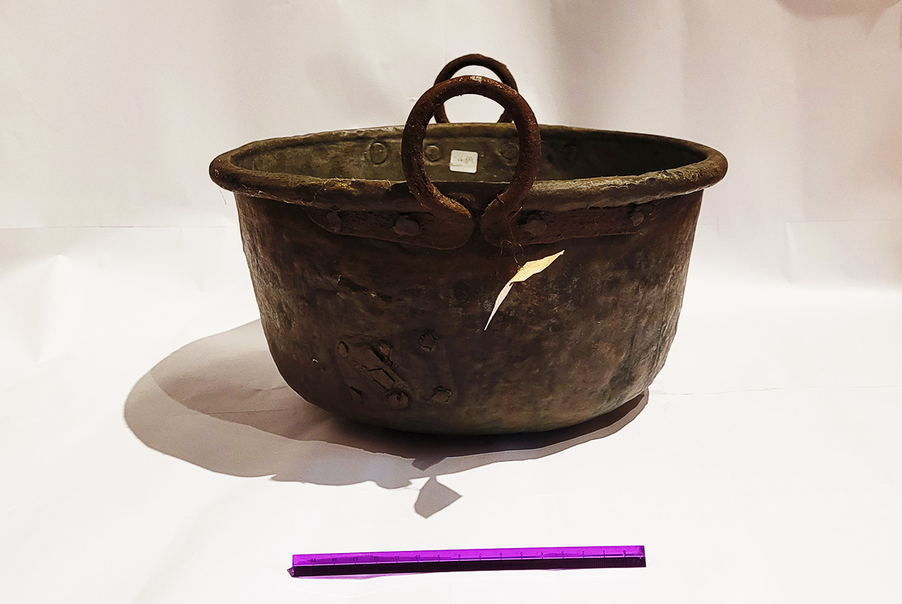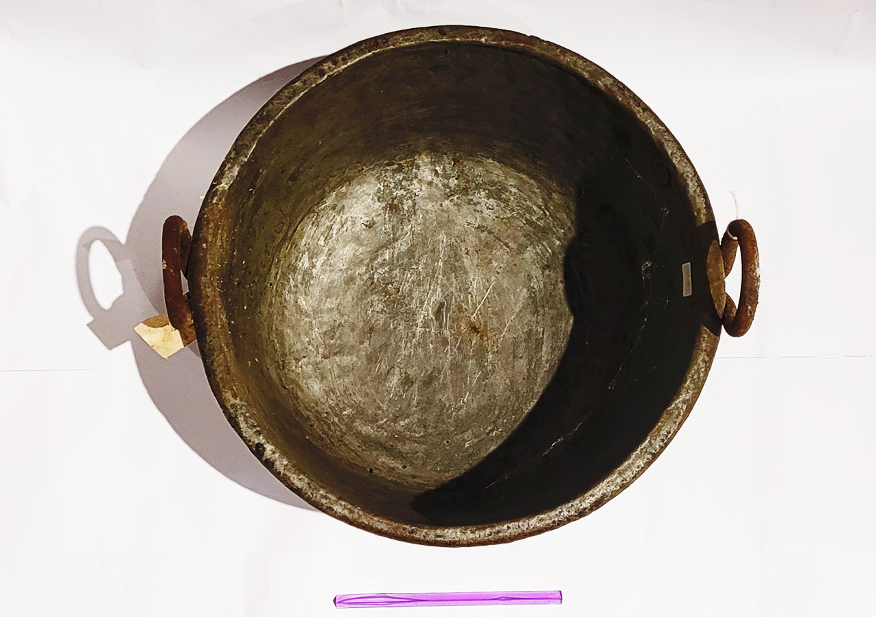 Contenitore cilindrico a base circolare con due manici orientati verso l'alto; il bordo superiore della caldara è risvoltato verso l'esterno, per creare una ghiera di irrigidimento