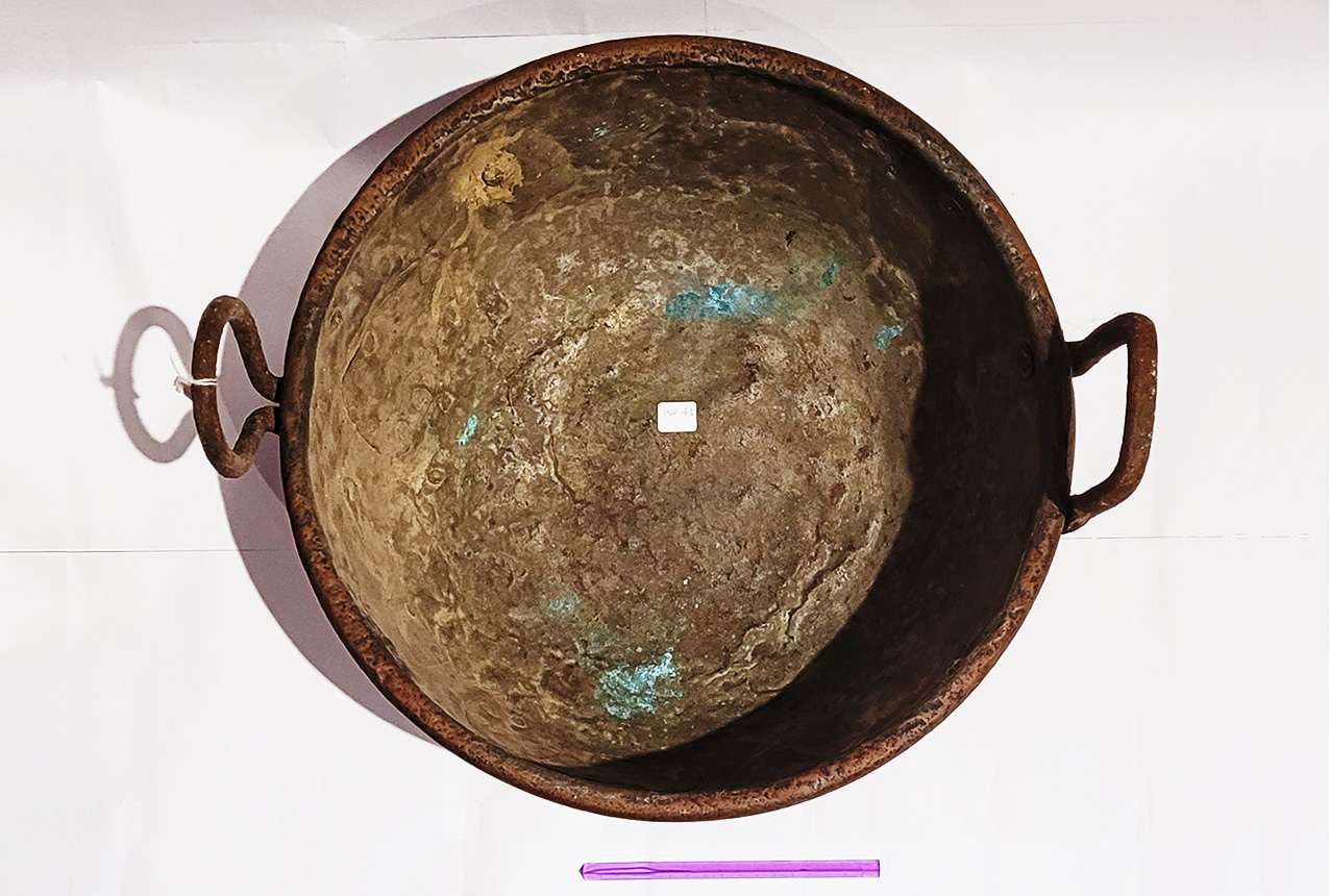 Contenitore cilindrico a base circolare con due manici orientati verso l'alto (uno ad anello ed uno quadrangolare); il bordo superiore della caldara è risvoltato verso l'esterno, per creare una ghiera di irrigidimento