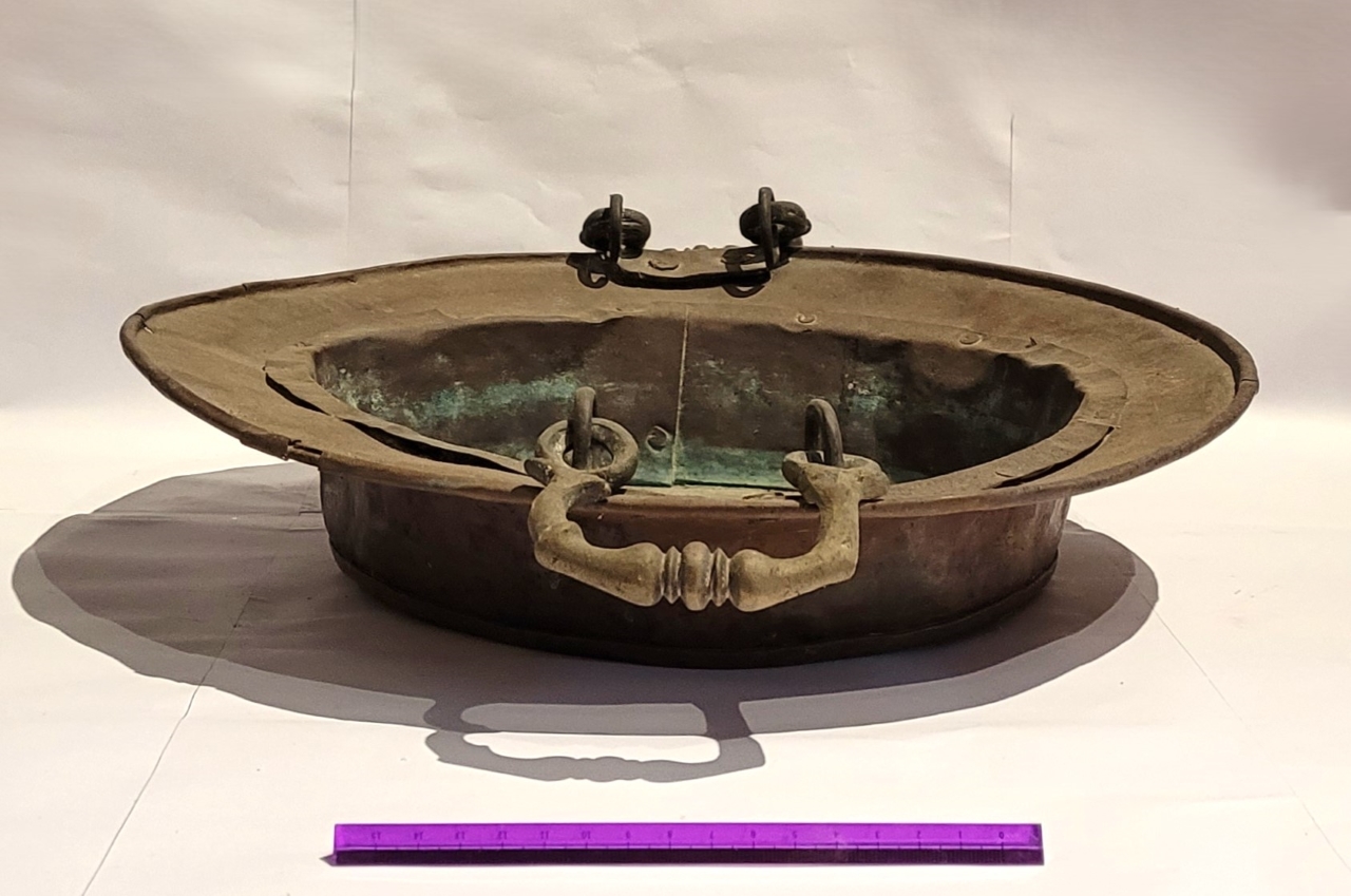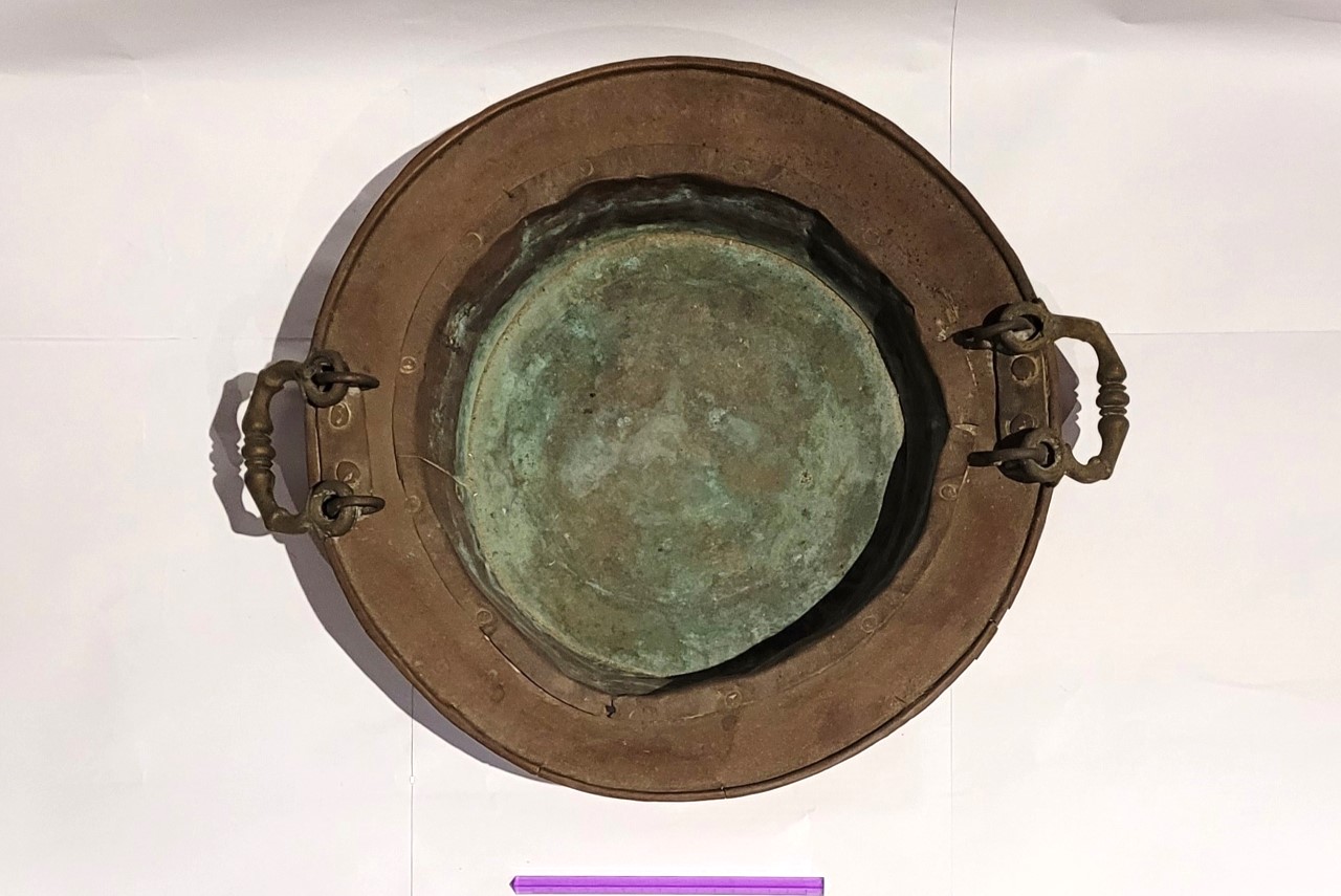 Basso contenitore metallico di forma cilindrica dotato di un bordo esterno a falda circolare, con manici laterali disposti simmetricamente. Il contenitore è realizzato con due lastre metalliche inchiodate e battute ed è privo di elementi decorativi, mentre i due manici, montati su una coppia di anelli, risultano variamente modanati (di sostituzione)