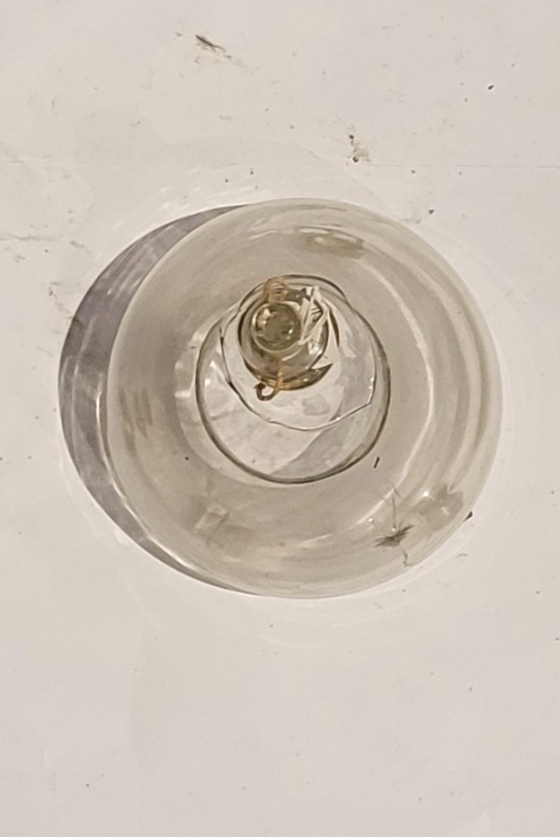 Oggetto in vetro costituito da un contenitore di forma semisferica terminante a collo di bottiglia e che si appoggia su tre piedini; sul fondo è ricavata una ampia apertura che forma una sorta di corona dal bordo rialzato. Sul collo di bottiglia, assicurato da una cordicella, è posizionato un tappo vitreo