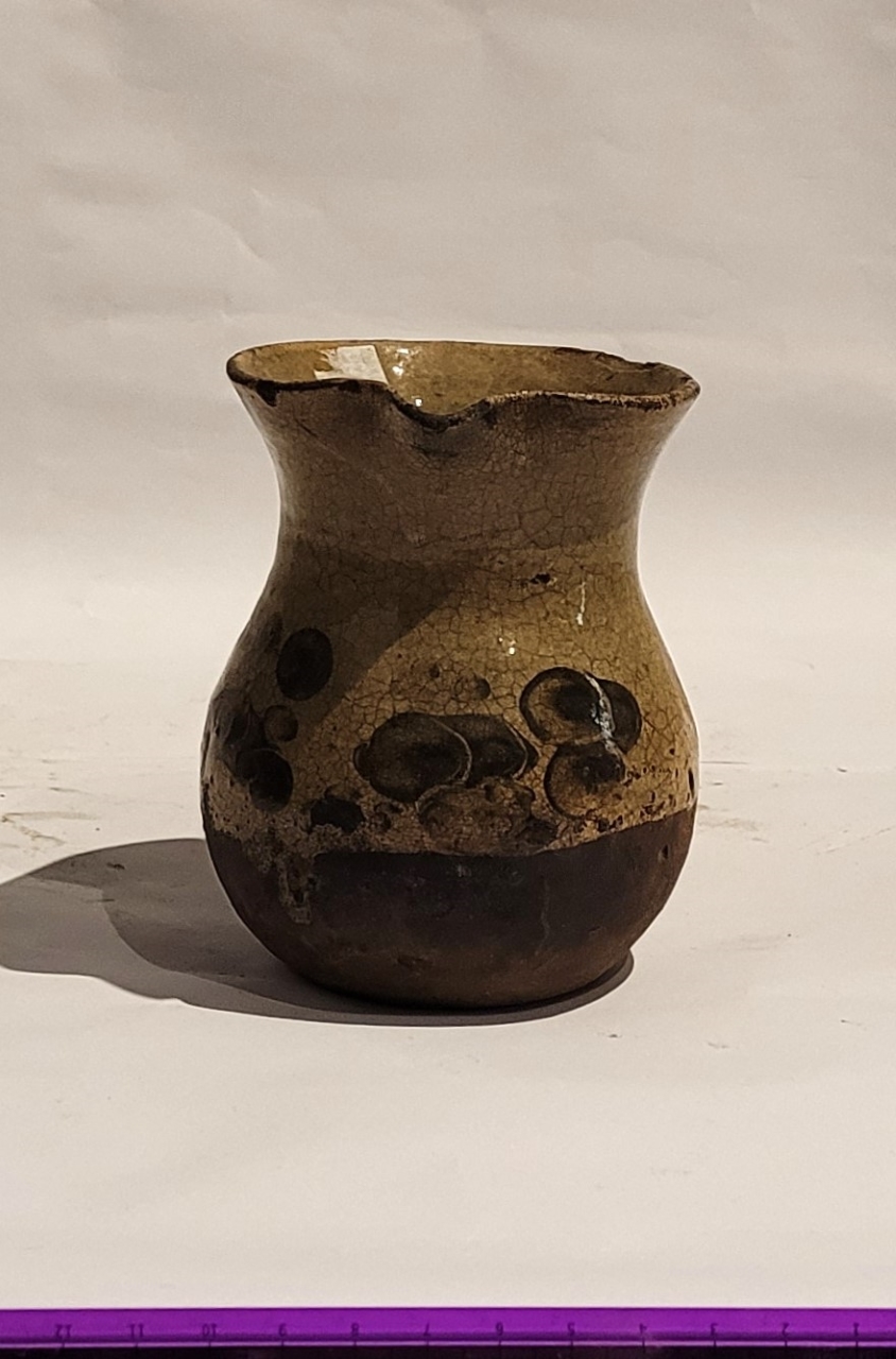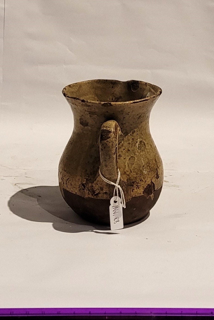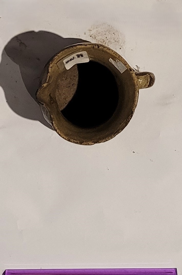Contenitore con base piatta a sezione circolare sviluppato in altezza con circonferenze variabili: panciuto per i primi due terzi dello sviluppo e di seguito con collo allargato. L’ampio collo è sagomato a versatoio con forma di beccuccio; in asse, sul lato opposto, è applicato un comodo manico a sezione circolare. L'interno e parte dell'esterno sono rifiniti a ingobbio di colore giallo ocra chiaro