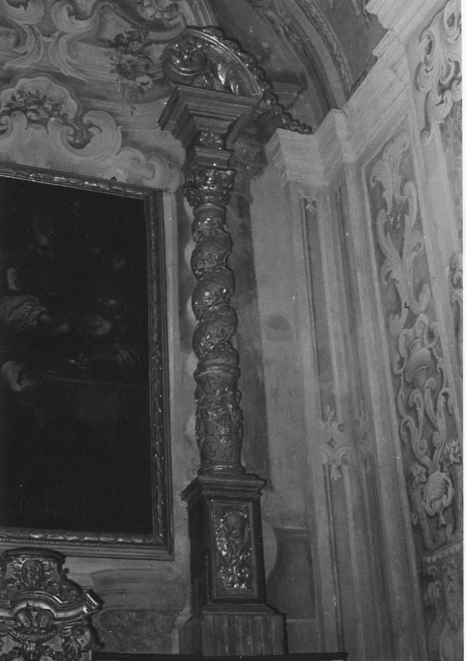 Colonne tortili poggianti su alti plinti, a loro volta poggianti su base scanalata, decorati con teste cherubiche. Le colonne sono dipinte a finto marmo beige e grigio, e percorse da racemi floreali dorati. Capitello corinzio che regge frammento di fastigio a grande voluta