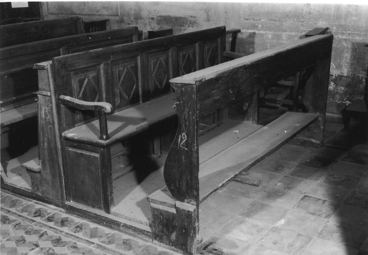 Banco dal dossale costituito da cinque pannelli intagliati a losanga e con braccioli, rari in questo tipo di mobile, sagomati