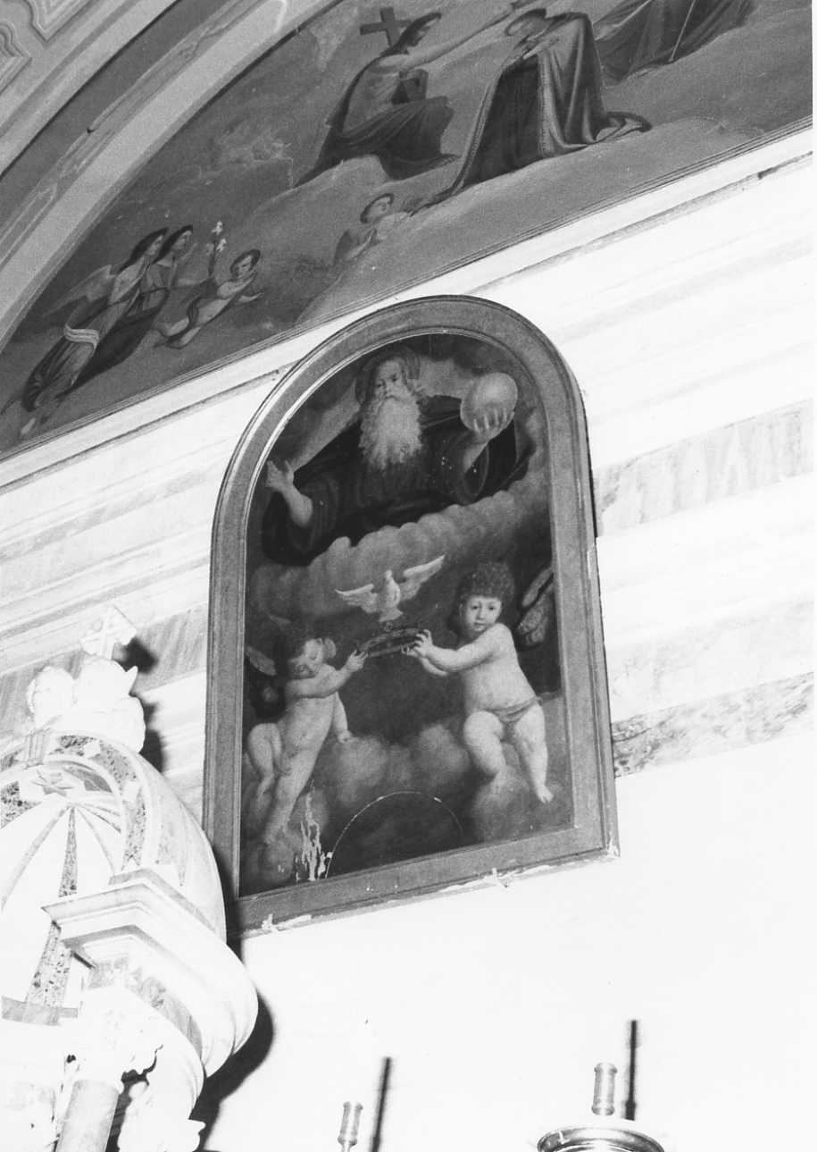 Il dipinto rappresenta Dio Padre barbuto con le braccia aperte che emerge dalle nubi, tenendo in mano un globo. In basso due angioletti ricciuti, seduti sulle nuvole, trasportano una corona al di sopra della quale, al centro della scena, c'è la colomba dello spirito santo
