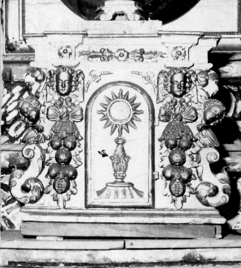 Tabernacolo in legno scolpito e dorato adorno di quattro teste cherubiche reggenti nastri e ghirlande di frutta; sullo sportello vi è raffigurato l'ostensorio raggiato