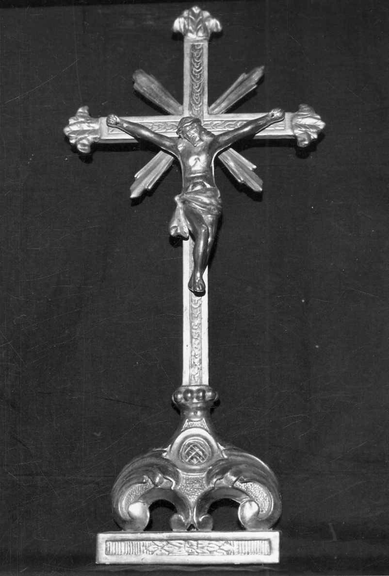 Base rettilinea; piede con grasse volute fogliacee e medaglione a graticcio in centro. Piccolo nodo con perline. Bracci rettilinei con decorazione a squame; terminazioni fitomorfe; raggiera. Statuetta di Cristo in metallo argentato. Dorata solo anteriormente